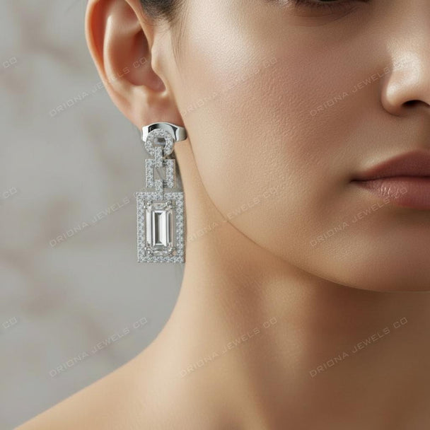 Art Deco Emerald Cut Diamond Stud Earrings, Double Halo