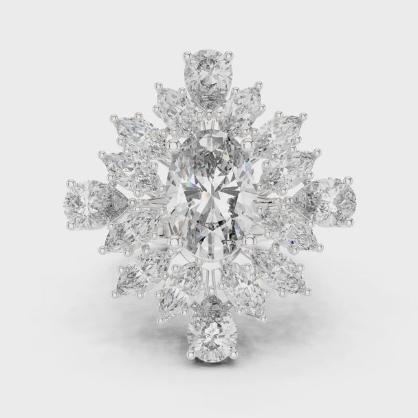 Art Nouveau 4 Ct Oval Cut Engagement Ring, Floral Sunburst Statement, Prong Set