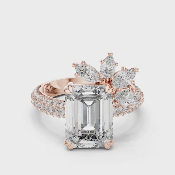 4ct Emerald Cut Art Nouveau Engagement Ring, Floral PavΓ© Band