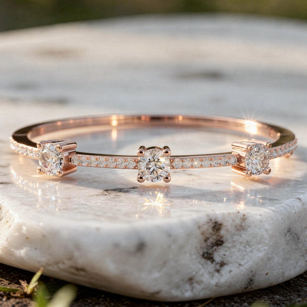 Three Stone Diamond Bangle, Solid Gold Bridal Bracelet