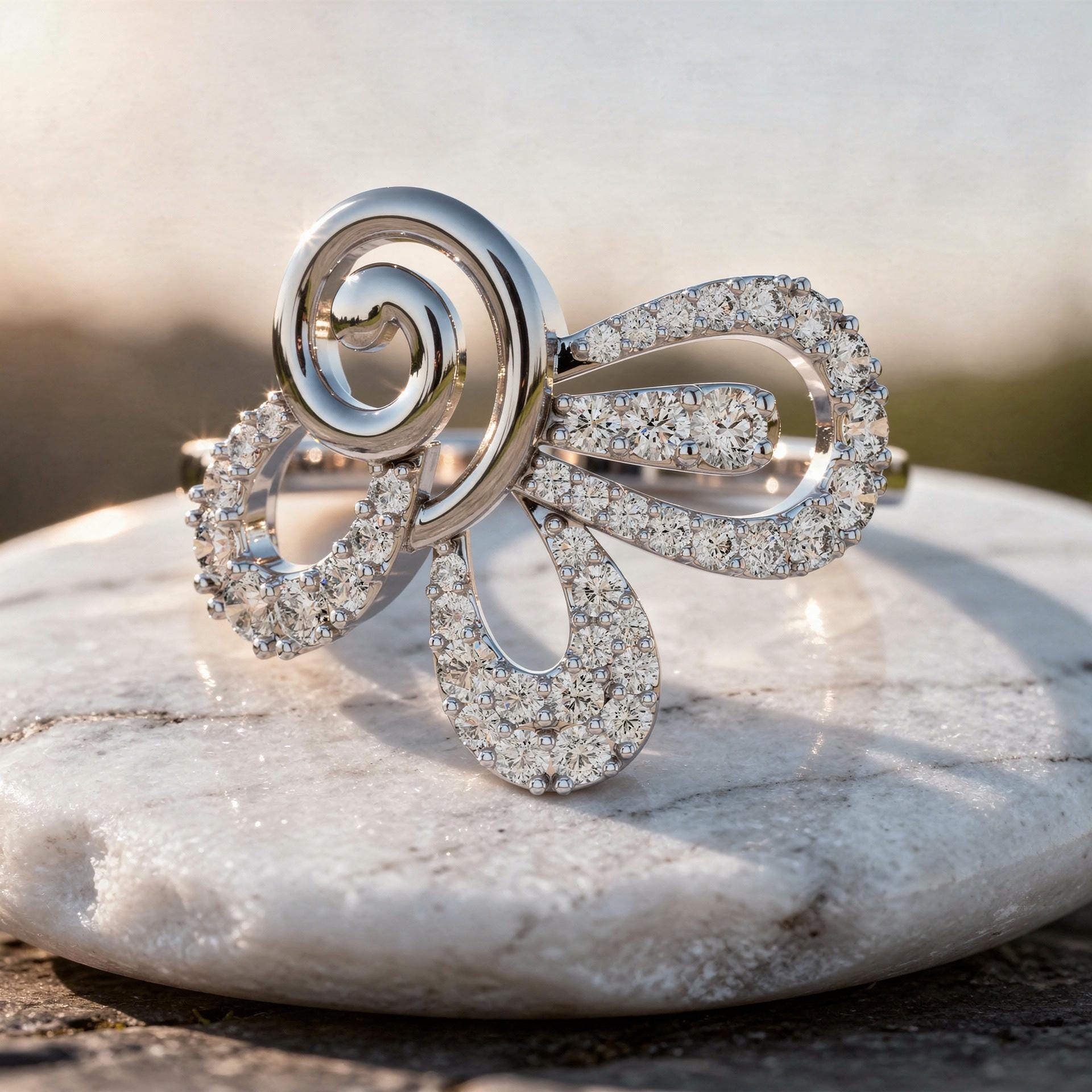 This contemporary statement ring features an abstract ribbon-inspired composition where fluid gold curves intertwine with pavé diamond-set loops. A polished spiral accent anchors the design, adding movement and artistic depth. The asymmetrical flow creates a bold yet elegant silhouette, making this ring a perfect balance of modern artistry and refined luxury.