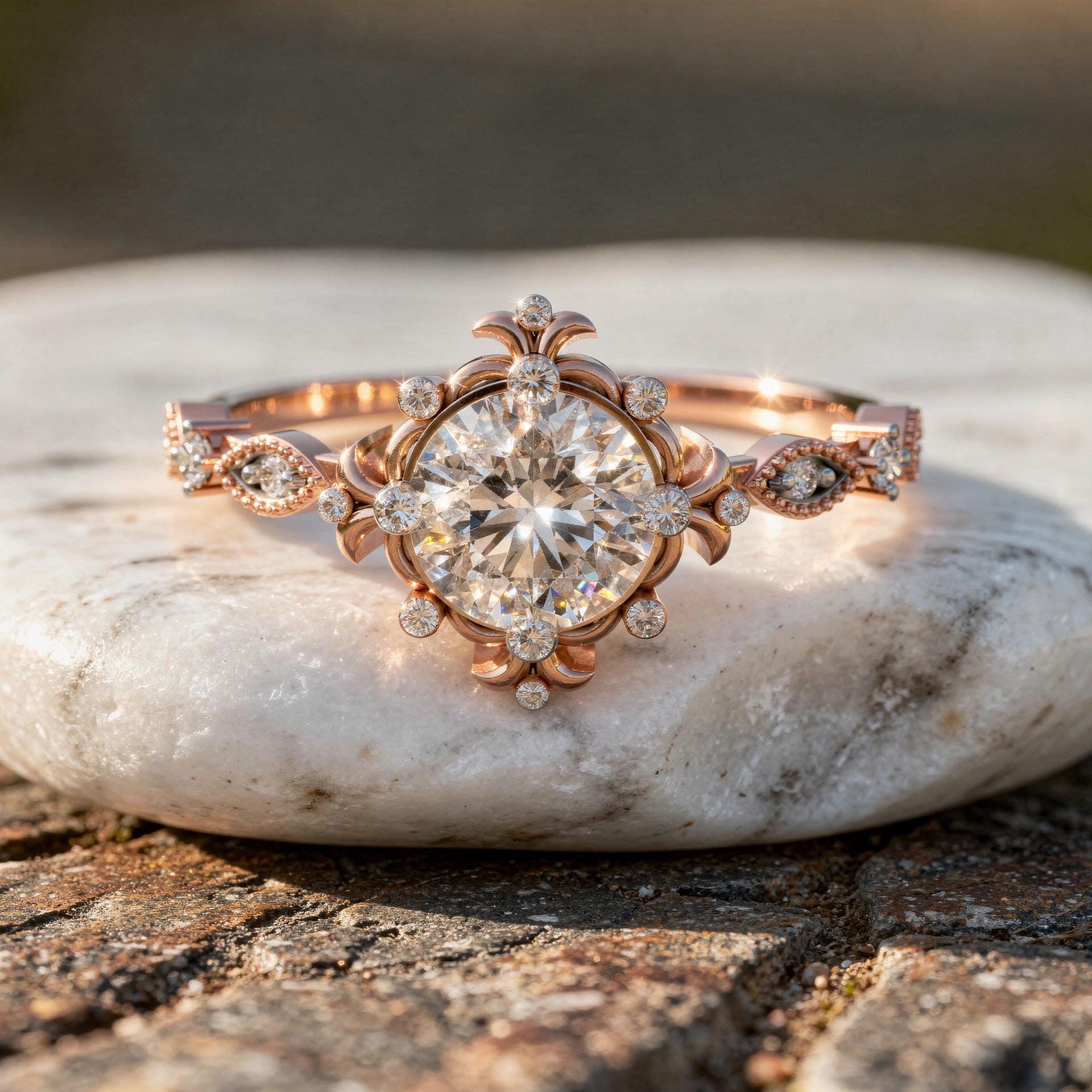The center stone is elevated for brilliance, while marquise-shaped accent diamonds add refined vintage character, creating a timeless yet artistic statement ring.