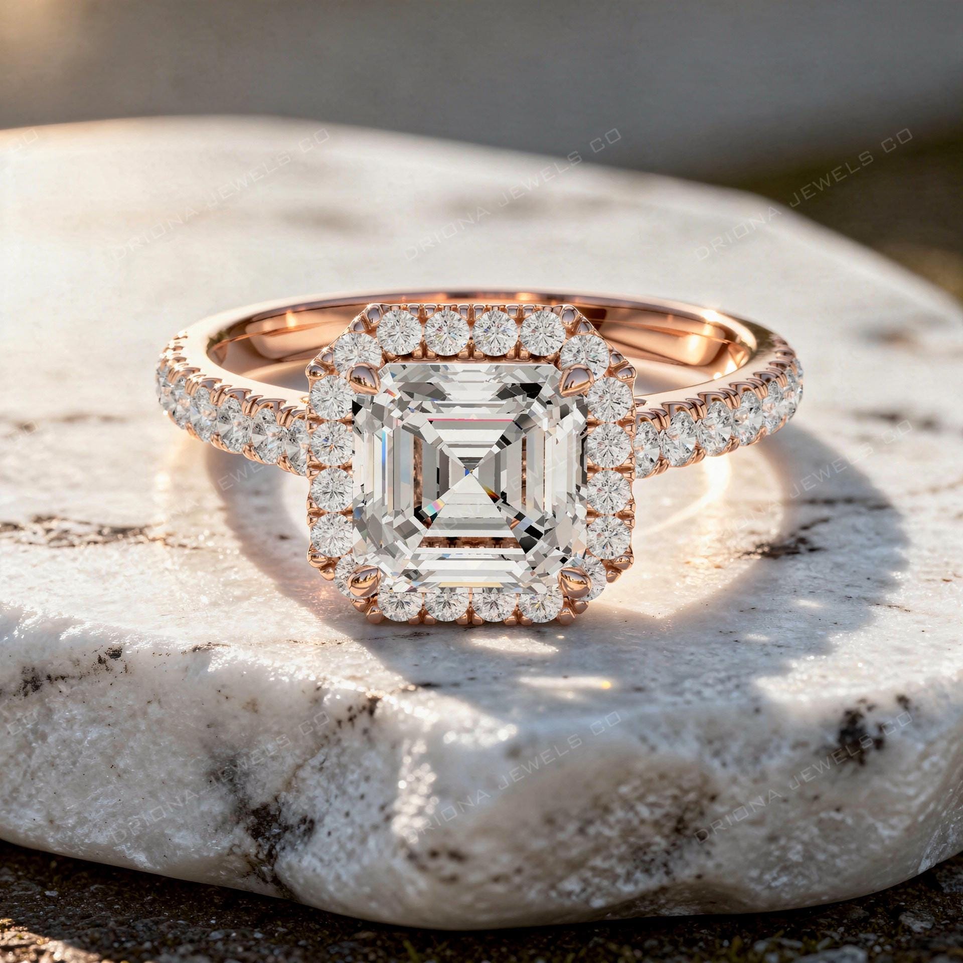 - Asscher Cut Diamond Halo Engagement Ring with Pavé Band, Elegant Bridal Ring