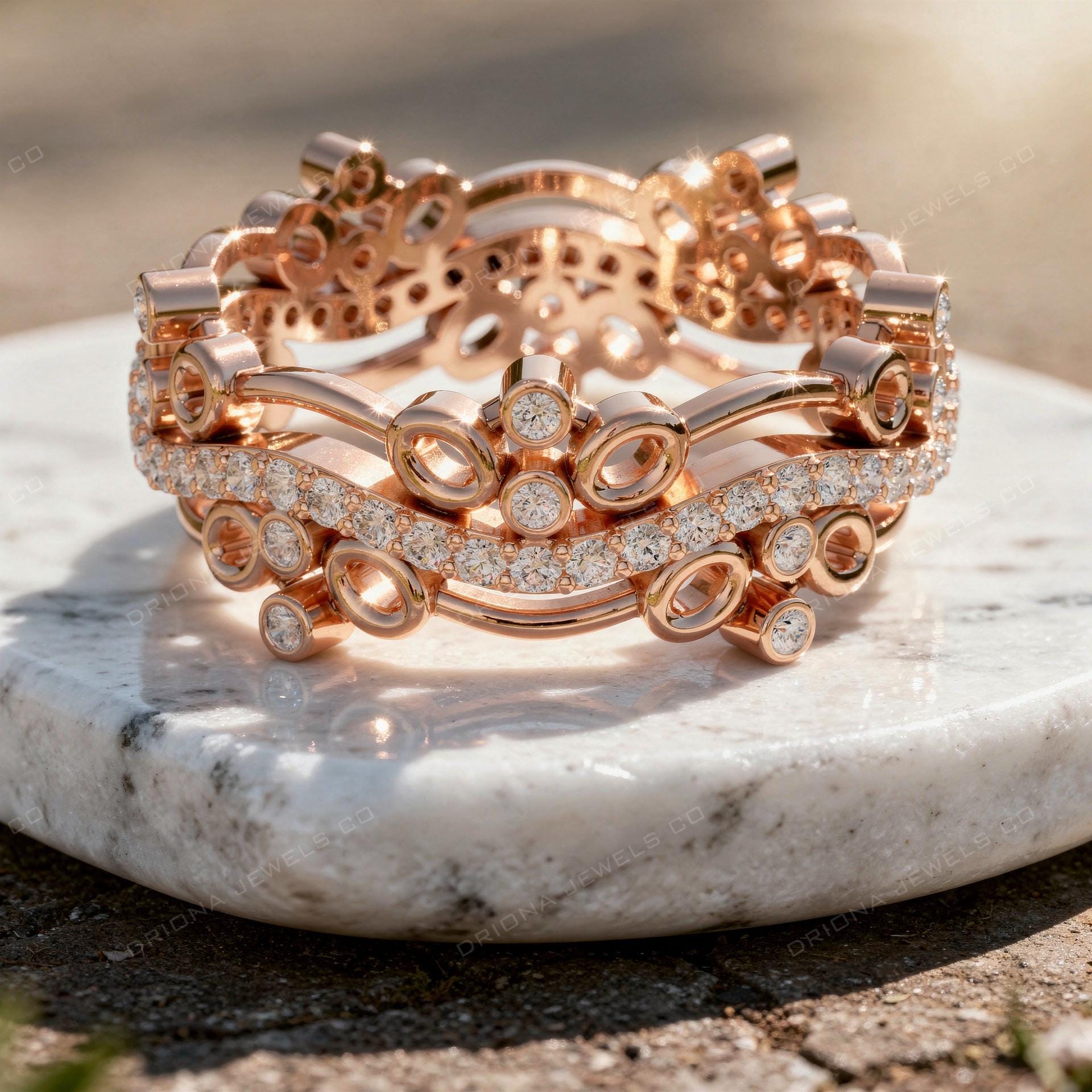 This bezel diamond stackable band ring features a bold, modern design with multiple round diamonds set in smooth bezel settings for a refined yet striking appearance. The layered structure and sculptural details create depth and dimension, making this ring a true statement piece.