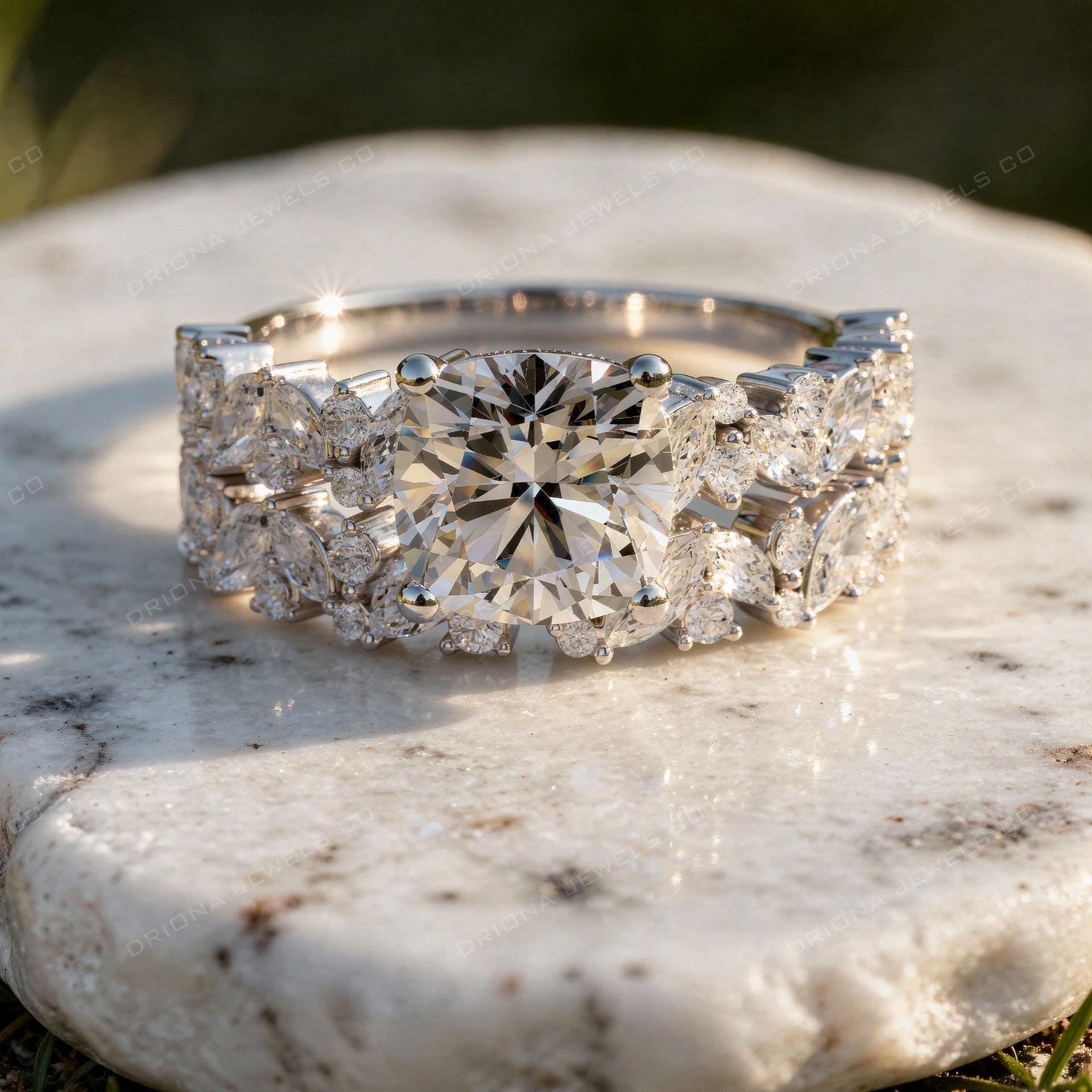 Inspired by Edwardian-era jewellery aesthetics, this design highlights symmetry, fine detailing, and graceful luxury. The combination of a cushion cut center and multi-stone setting gives the ring a timeless appeal while still feeling distinctive and modern.