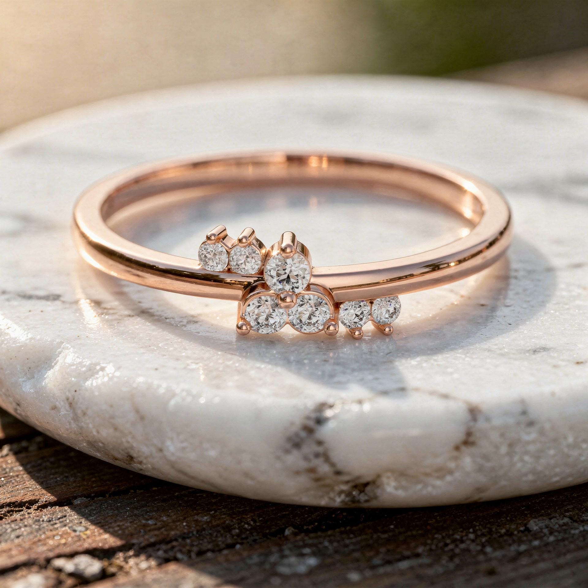 A minimal and elegant diamond cluster ring featuring a delicate asymmetrical arrangement of round diamonds on a slim polished band. The subtle cluster creates a soft sparkle profile, making it ideal for stacking, everyday wear, or a modern promise ring.