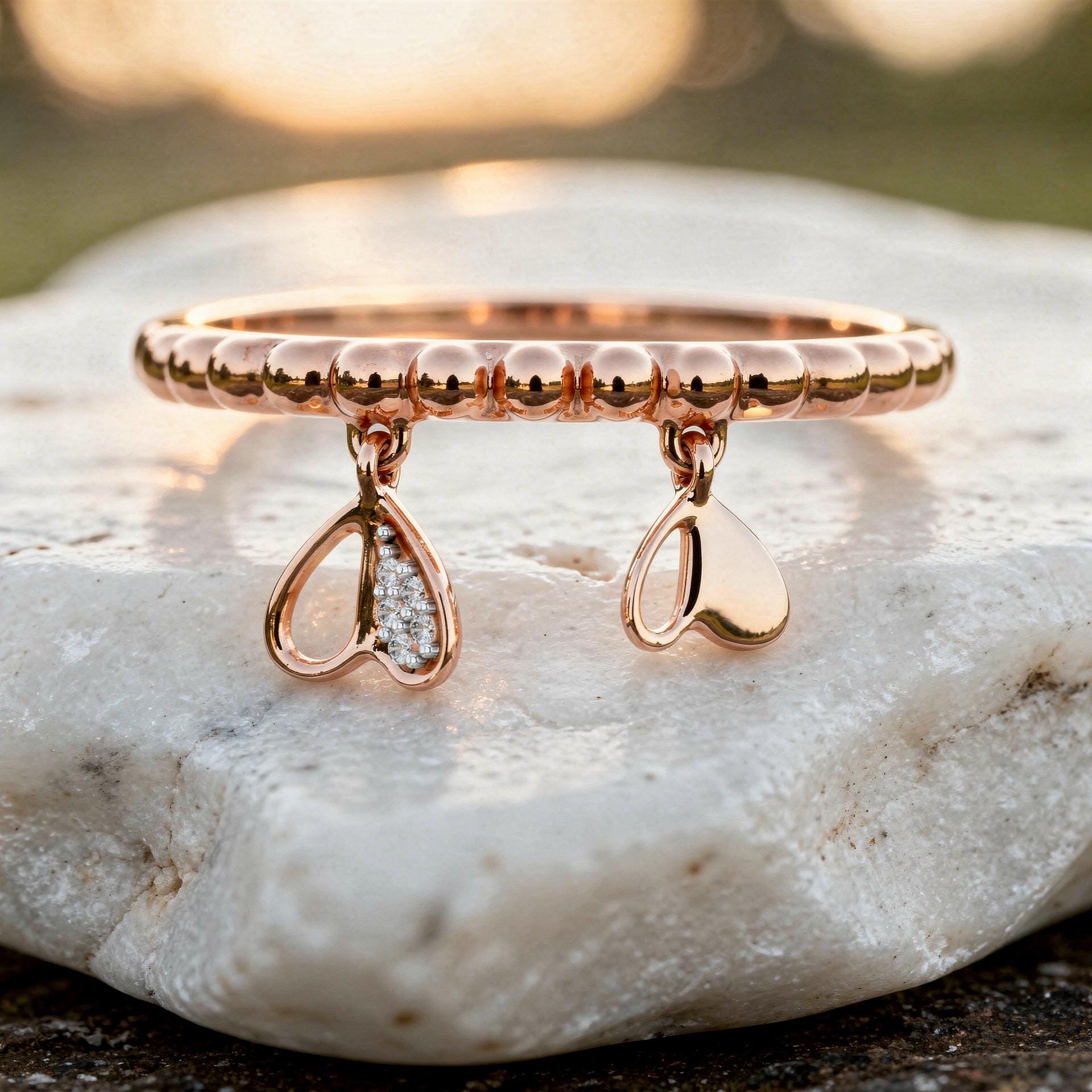 - Dangling Heart Diamond Ring Beaded Gold Band Romantic Minimalist Charm Style Ring