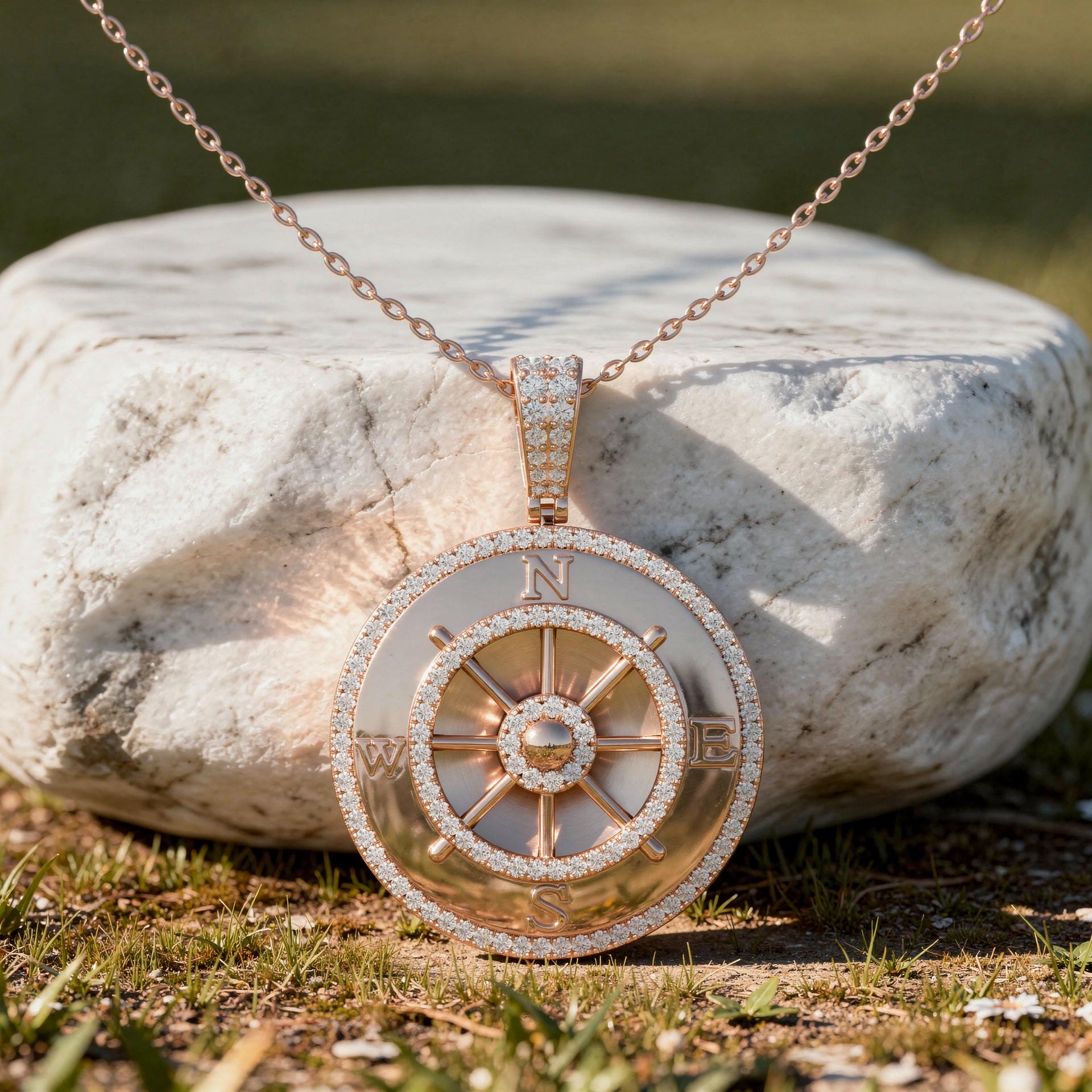 The detailed compass design sits within a circular diamond halo, creating a powerful yet refined statement. Designed for those who carve their own path, this piece blends symbolism with modern fine jewelry elegance.