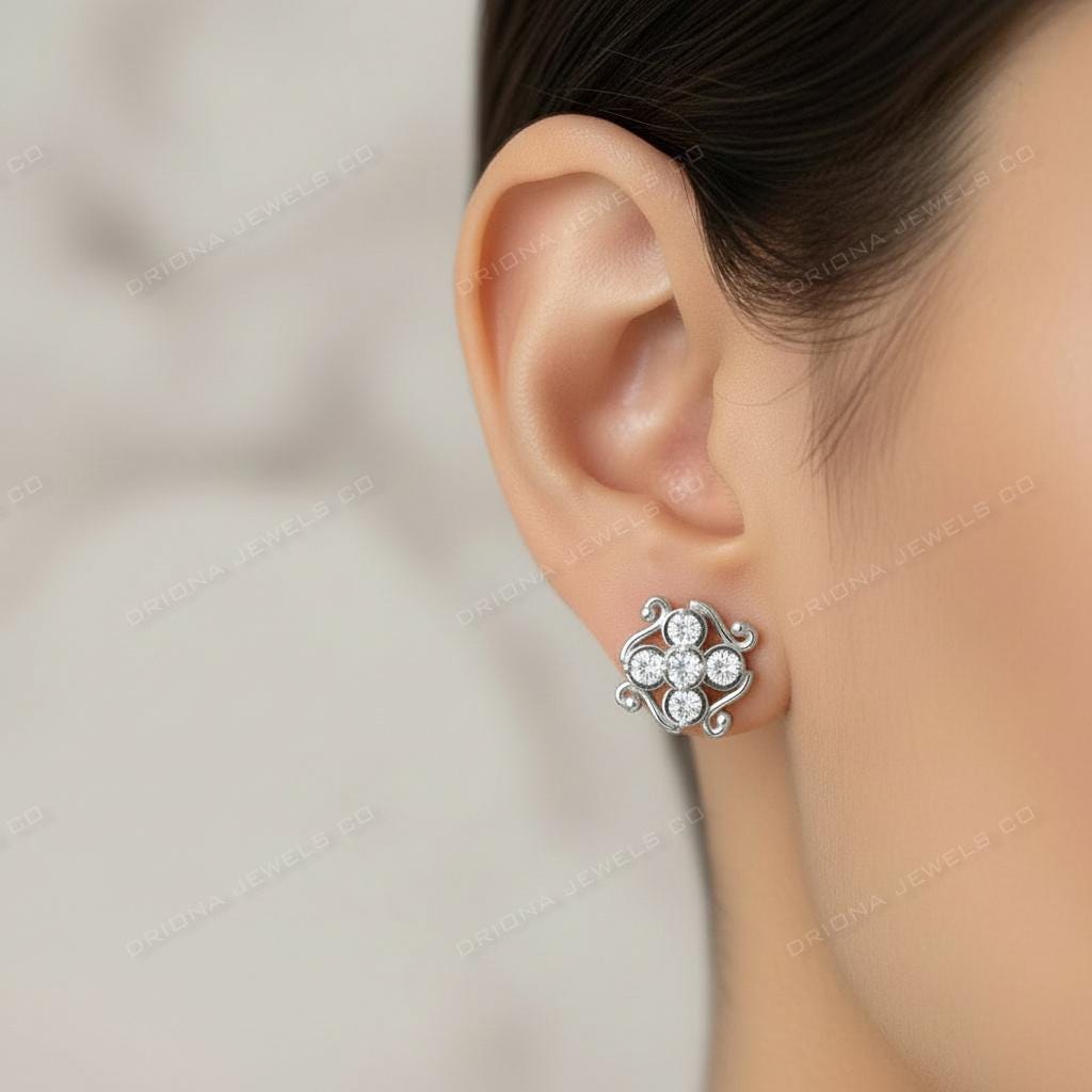 These diamond floral cluster stud earrings feature a graceful arrangement of round brilliant diamonds forming a delicate flower-inspired silhouette. The openwork design adds depth and dimension, allowing light to pass through beautifully for enhanced sparkle.