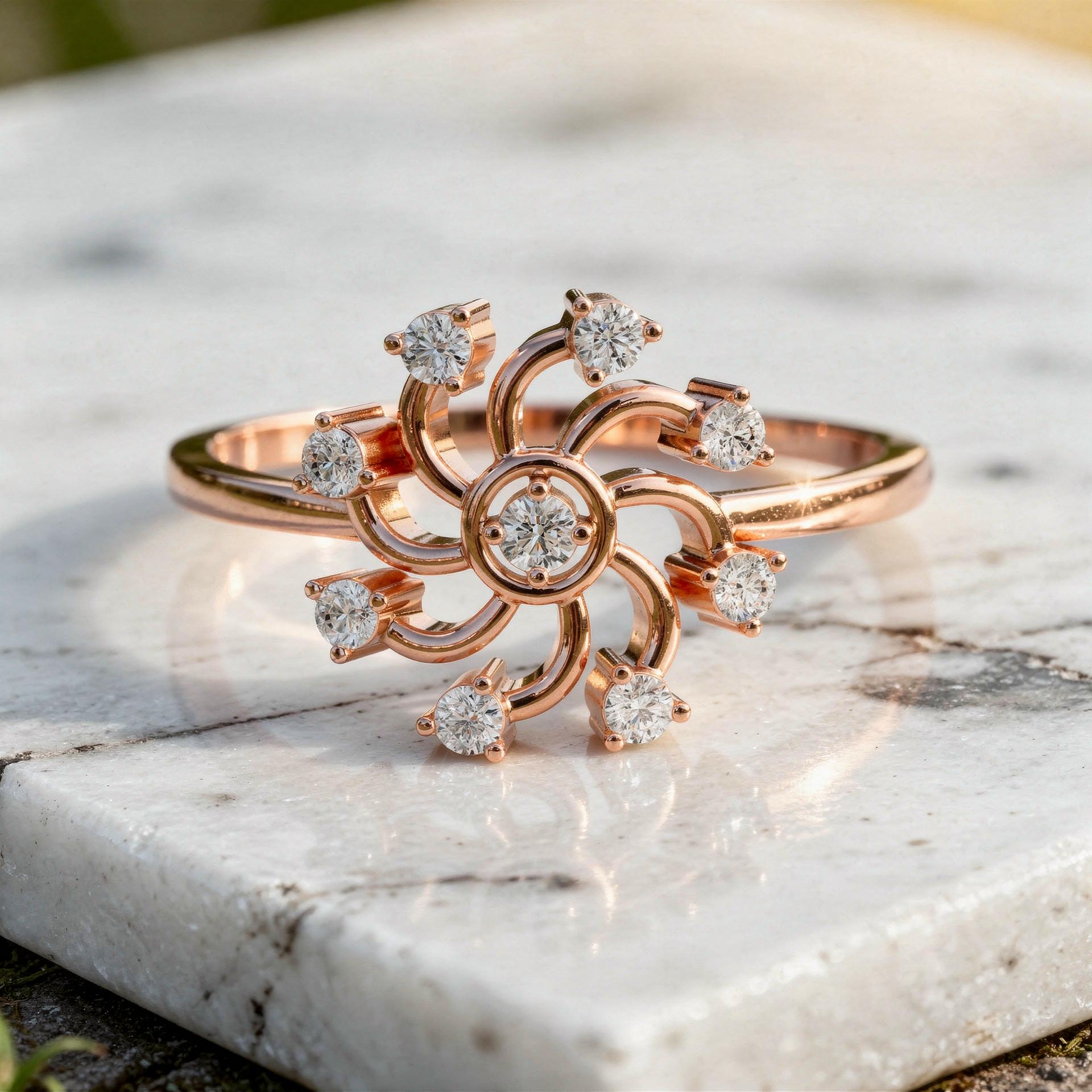 - Diamond Floral Statement Ring Solid Gold Sunburst Flower Ring for Women