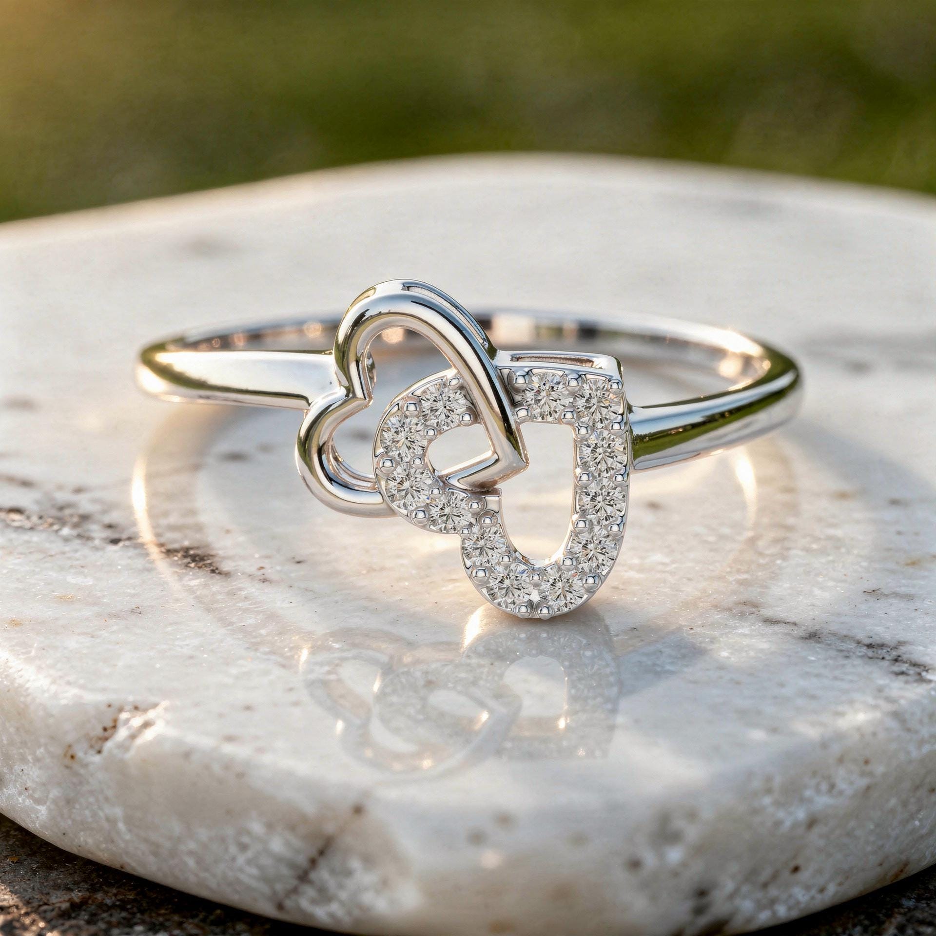 This elegant diamond ring features a modern open heart motif gracefully intertwined with a diamond-studded initial “U,” creating a meaningful and stylish design. The letter form is highlighted with precisely set round diamonds that enhance brilliance while maintaining a clean, contemporary look.