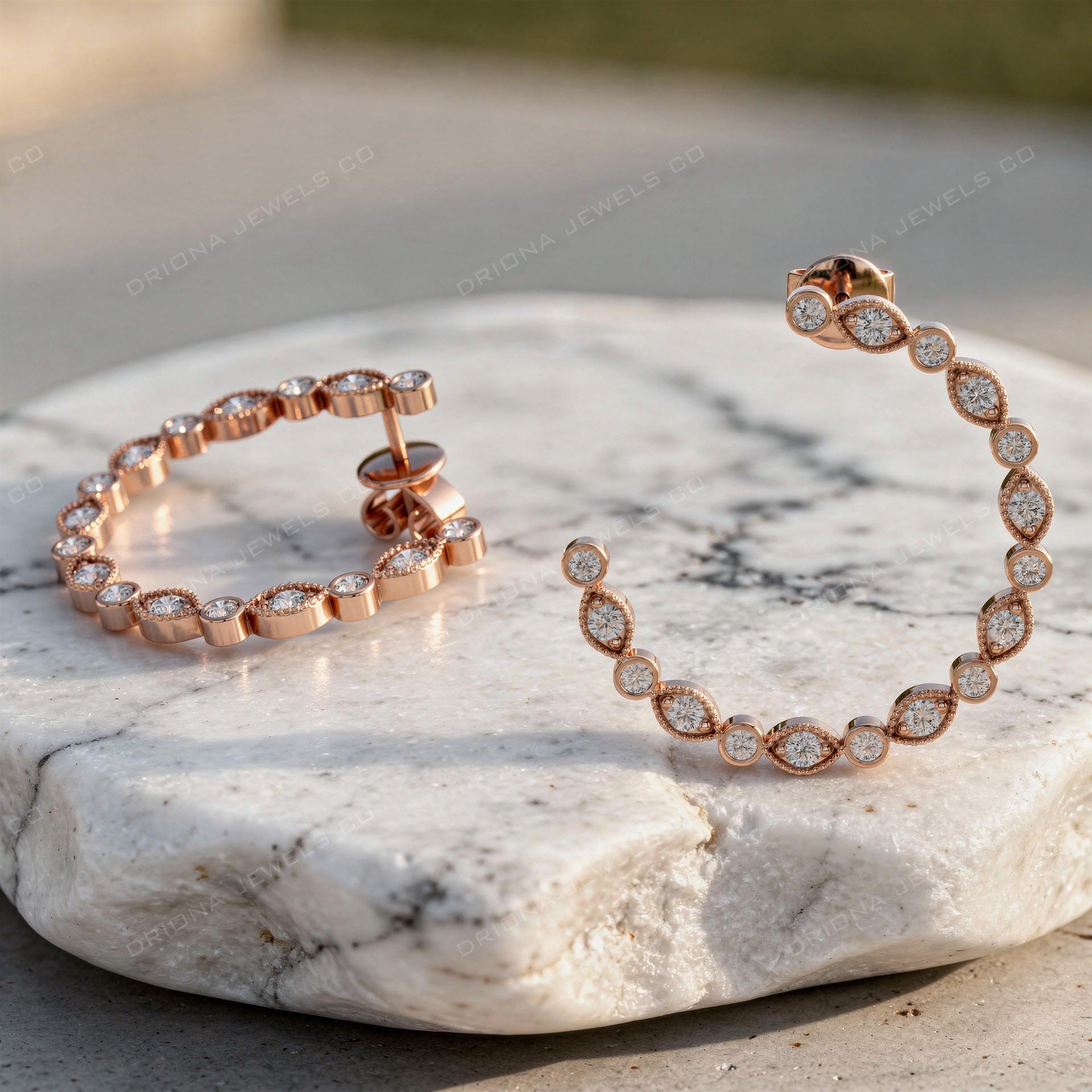 These elegant hoop earrings showcase a graceful sequence of marquise and round diamonds, framed in a delicate halo-style design that enhances brilliance from every angle. The balanced pattern creates a refined sparkle while maintaining a lightweight and wearable silhouette.