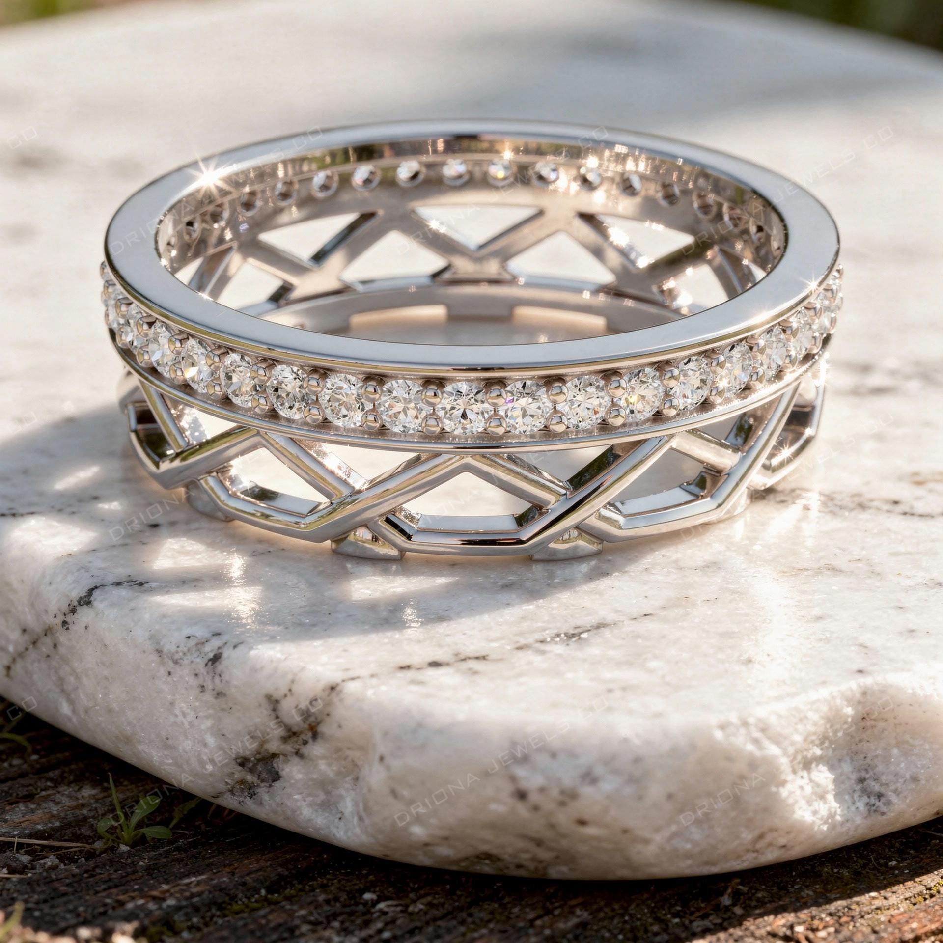 - Diamond Pavé Wedding Band With Geometric Openwork Design Modern Statement Ring