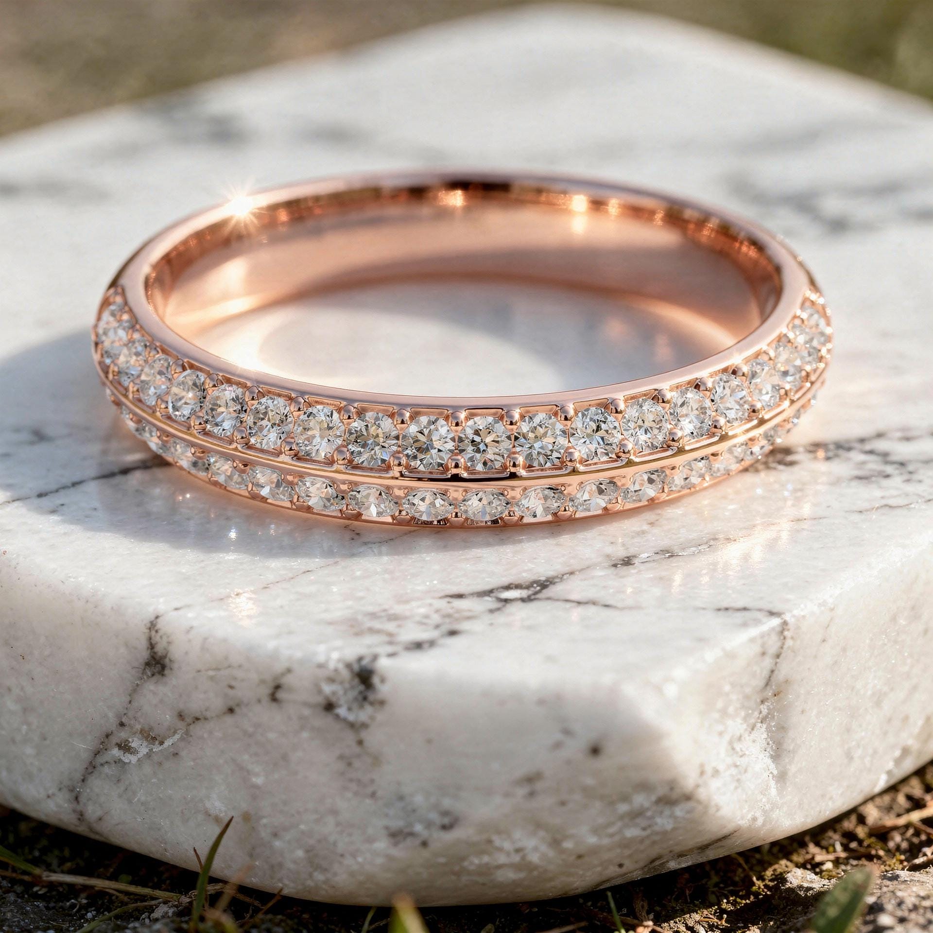 - Diamond Wedding Band Double Row Pavé Ring, Solid Gold Moissanite or Lab Grown