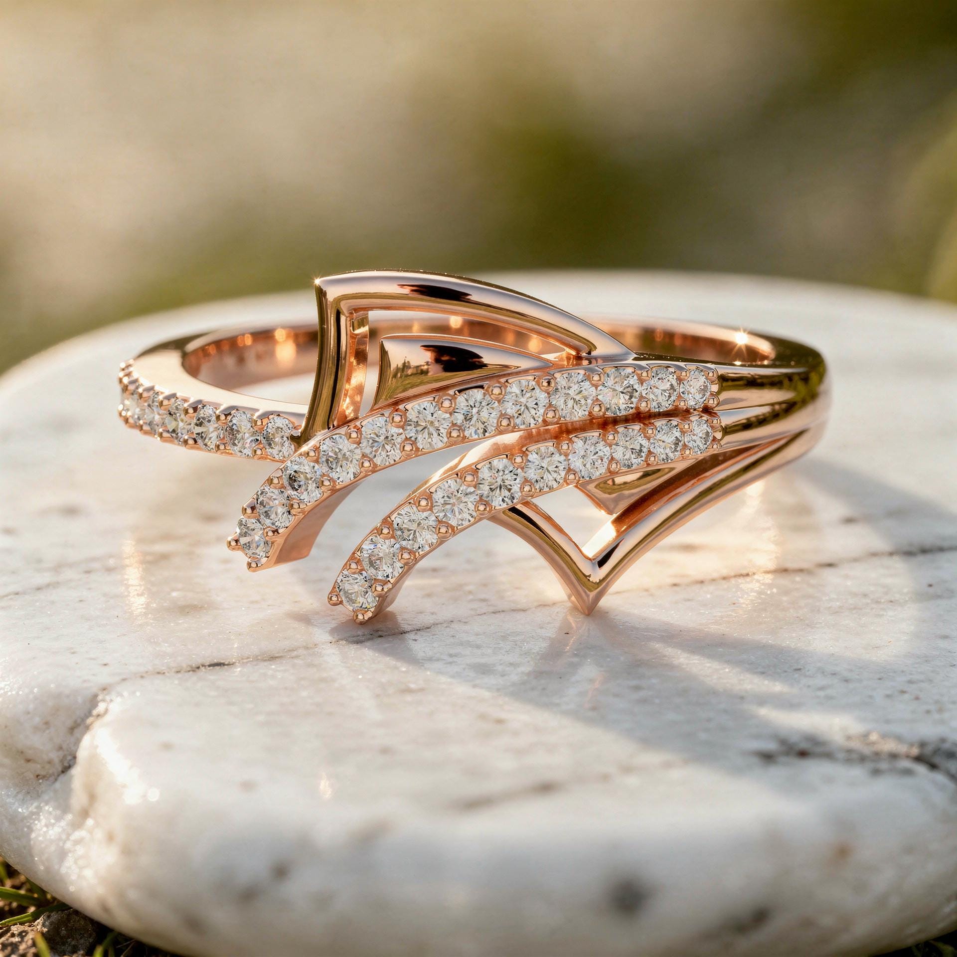 This modern diamond ring showcases a bold double-curve crossover design enhanced with pavé-set round diamonds. The layered flowing lines intersect with sharp chevron-inspired edges, creating a striking balance between softness and structure. Designed to sit elegantly across the finger, this ring delivers a contemporary statement with refined sparkle, perfect for everyday luxury or standout styling.