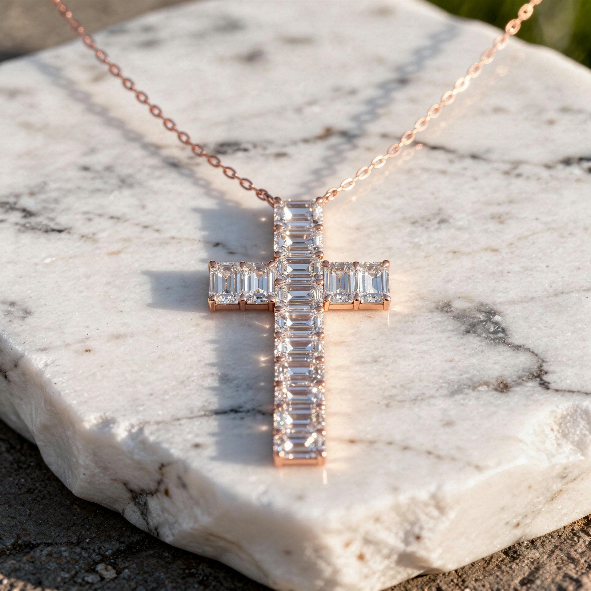 Crafted in luminous 14K rose gold, this emerald cut diamond cross necklace is a bold expression of faith and refined elegance.