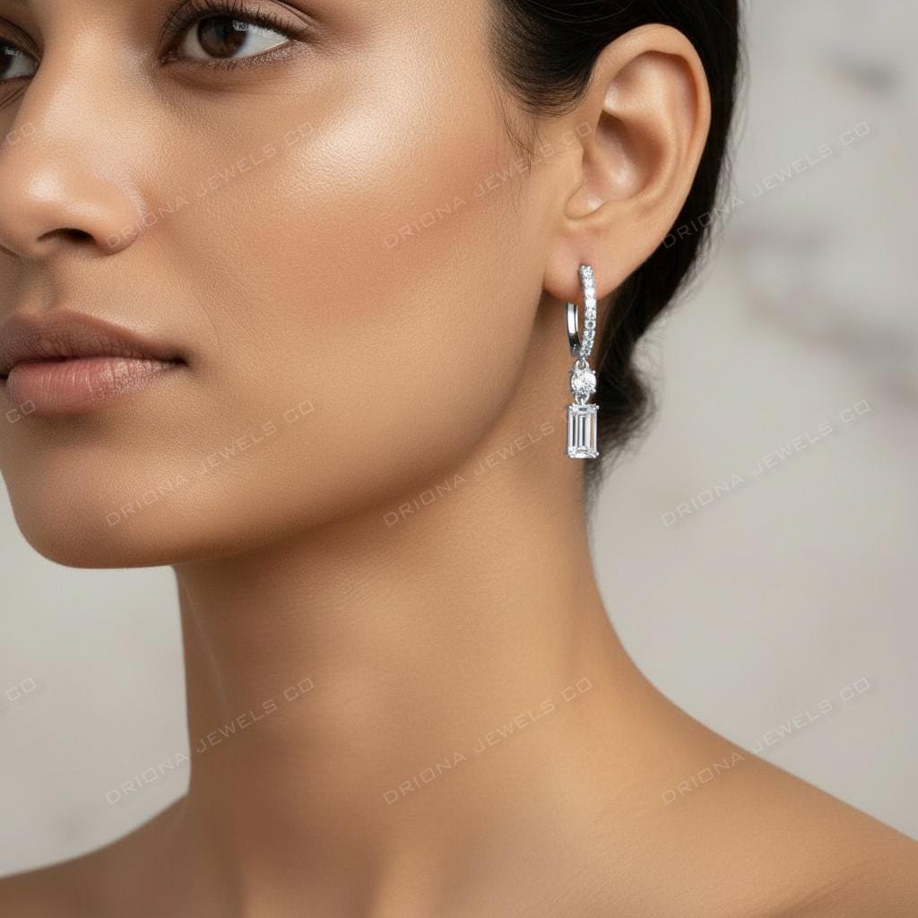 These refined emerald-cut drop earrings feature a sleek vertical diamond bar stud accented with pavé stones, leading to a brilliant round connector and a striking rectangular drop stone. The elongated silhouette adds graceful movement and timeless sophistication, making these earrings perfect for elegant occasions and formal styling.