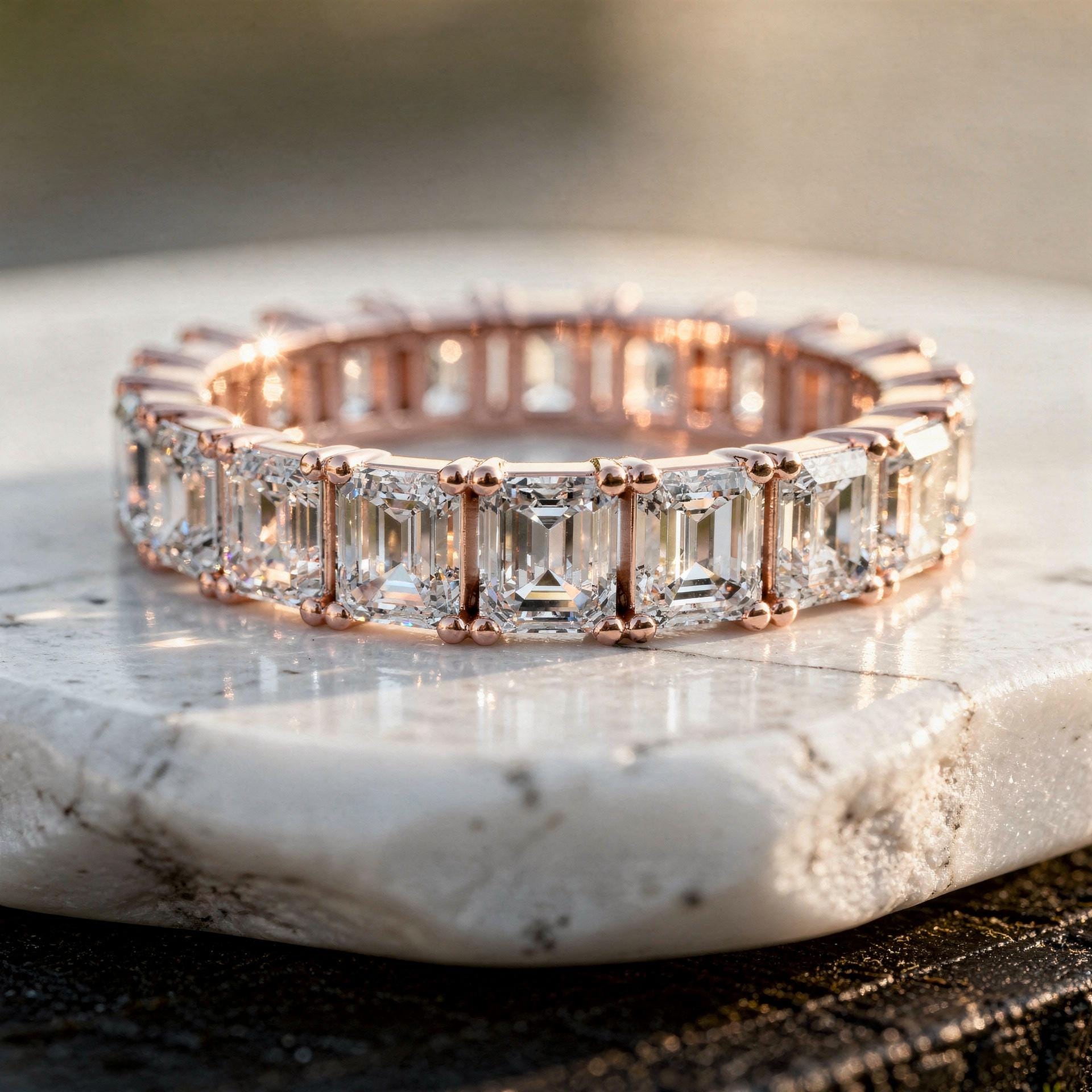 This emerald cut eternity ring showcases a continuous row of step-cut stones set in a refined prong setting, creating a bold and elegant full eternity design. The elongated emerald cut diamonds deliver a sophisticated hall-of-mirrors brilliance, offering understated luxury and modern refinement.