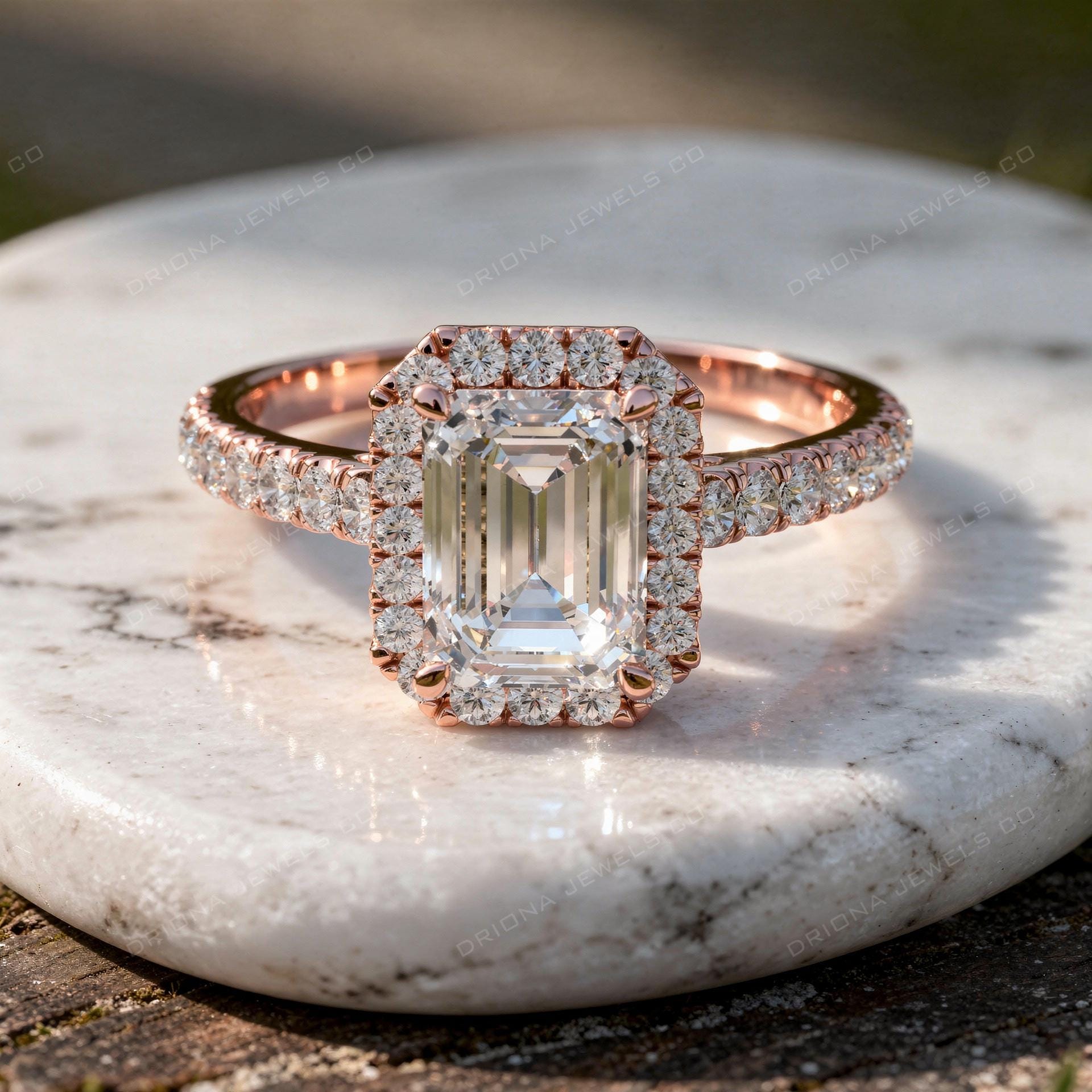 - Emerald Cut Diamond Halo Engagement Ring with Pavé Band in Rose Gold