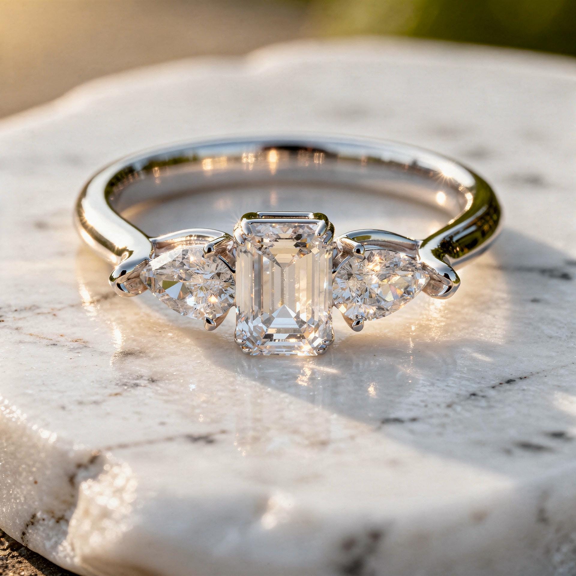This emerald cut engagement ring features a refined three stone design with pear shaped side stones, crafted in 10K, 14K, or 18K solid gold. The step cut emerald center delivers sophisticated brilliance, while the pear side stones enhance dimension and balance.