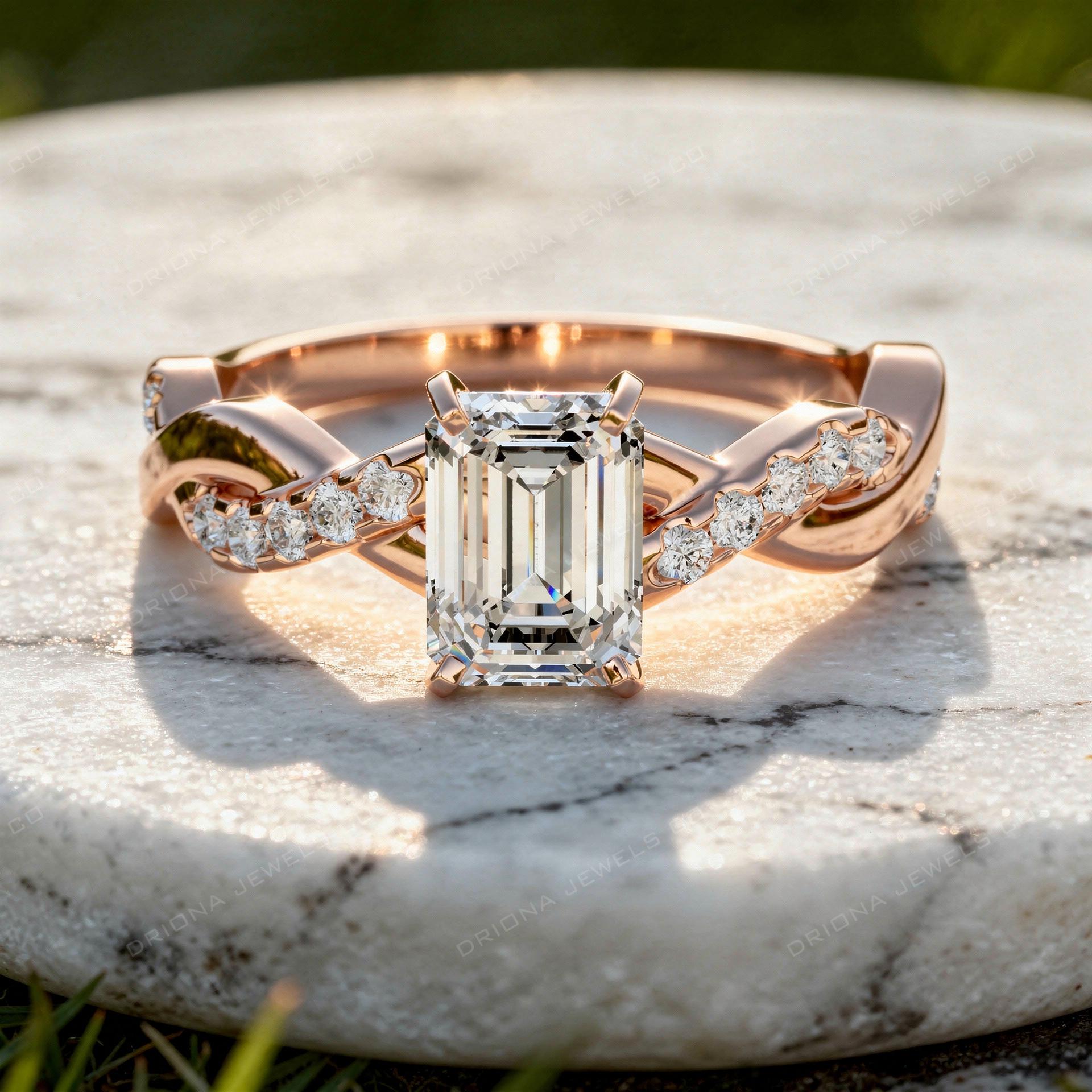- Emerald Cut Engagement Ring with Twisted Diamond Accent Band