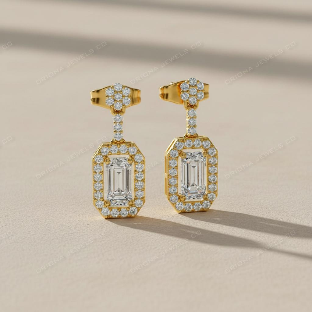 These elegant halo drop earrings feature a striking emerald-cut center stone framed by a diamond halo and suspended from a floral diamond stud top. The elongated rectangular silhouette adds graceful movement, making these earrings ideal for formal wear, bridal looks, and statement occasions.