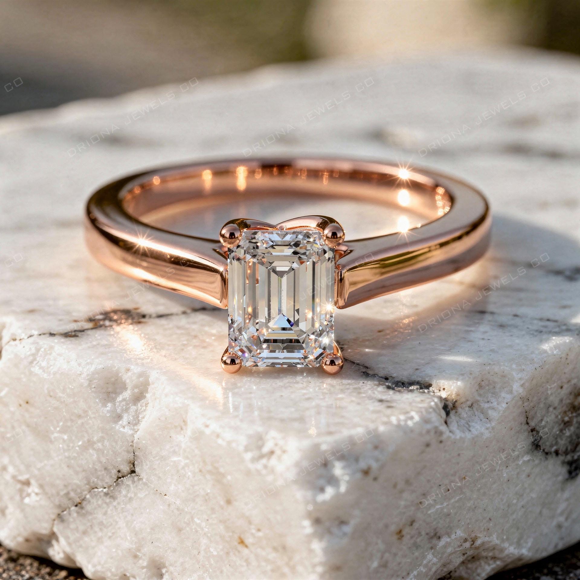 This emerald cut solitaire engagement ring features a sleek rectangular center stone secured in a timeless prong setting. The clean, unadorned band highlights the crisp step-cut facets, allowing the center stone to take full attention.