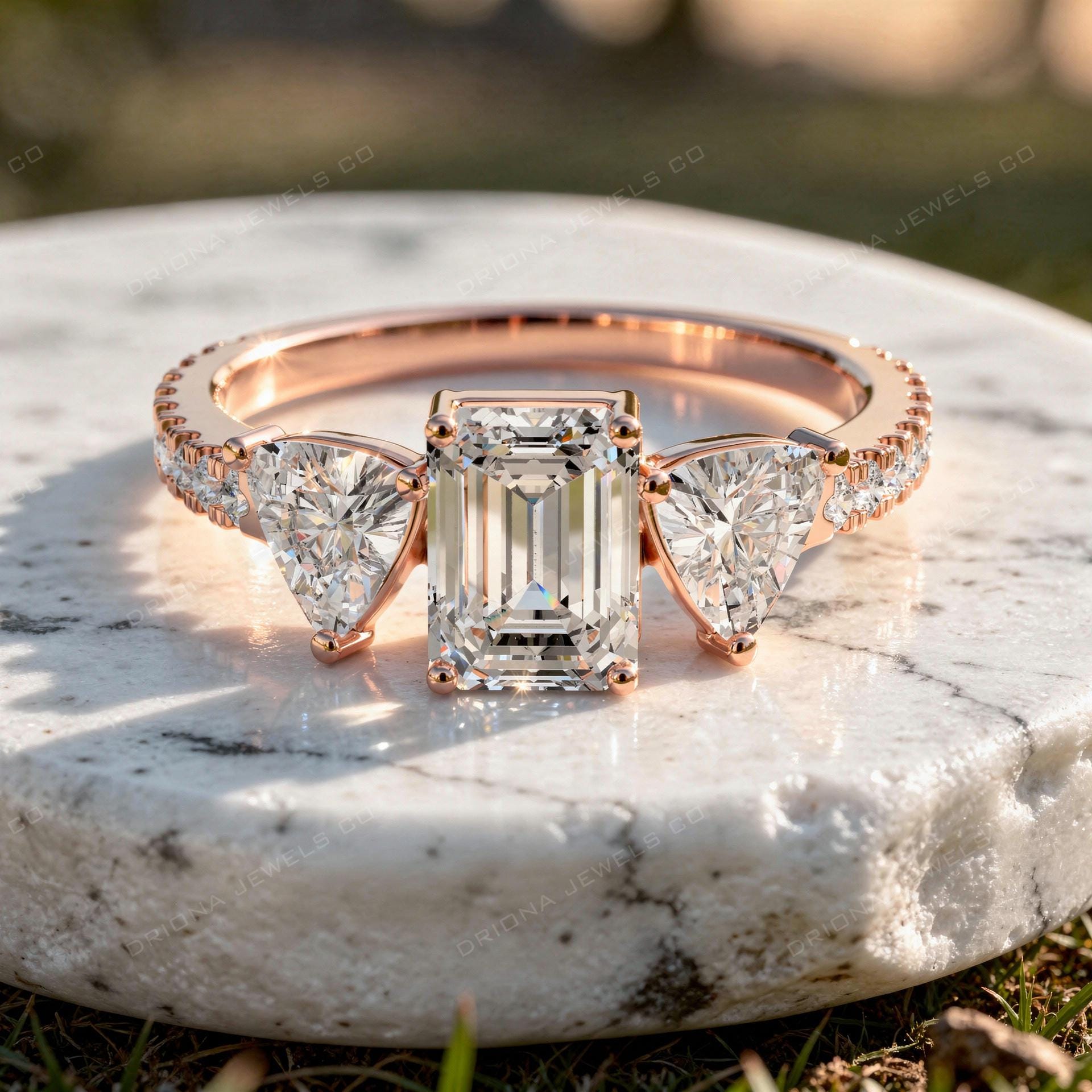 This emerald cut three stone engagement ring features a striking rectangular center stone paired with elegant trillion-cut side diamonds. The balanced three-stone design represents past, present, and future, making this ring deeply meaningful as well as visually stunning.
