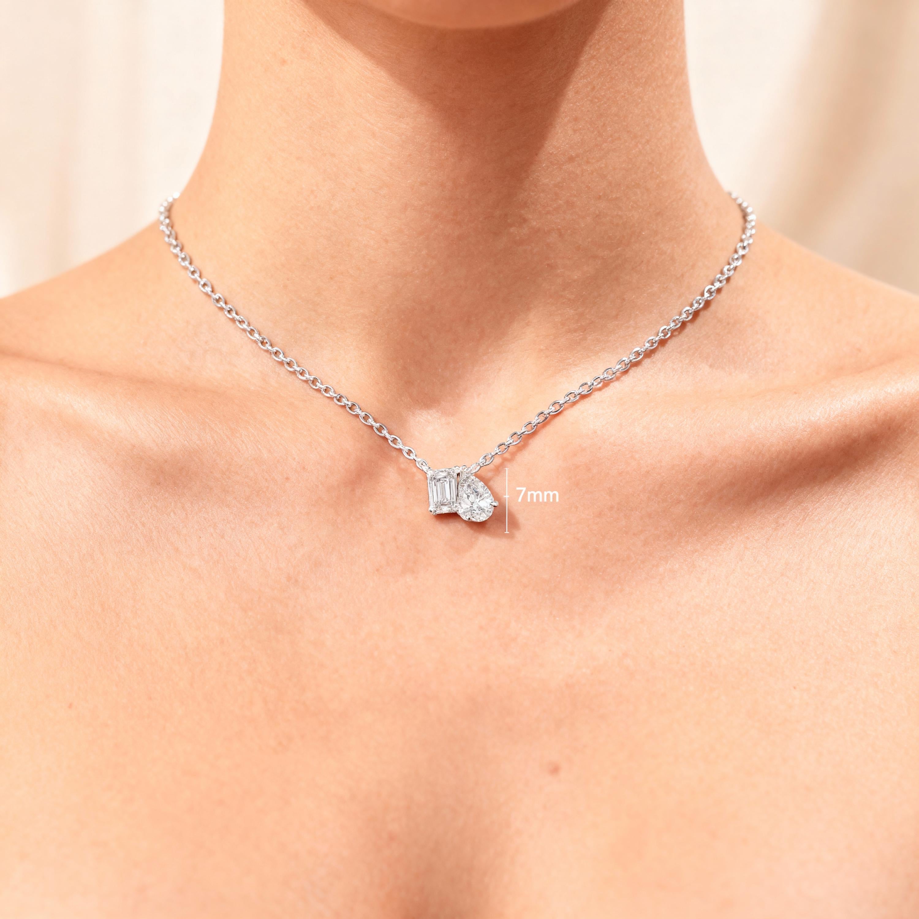 A modern expression of love and balance, this emerald and pear diamond pendant necklace is crafted in luxurious 14K rose gold. Featuring a sleek emerald-cut diamond paired beautifully with a brilliant pear-shaped diamond, this two-stone design symbolizes unity and connection.