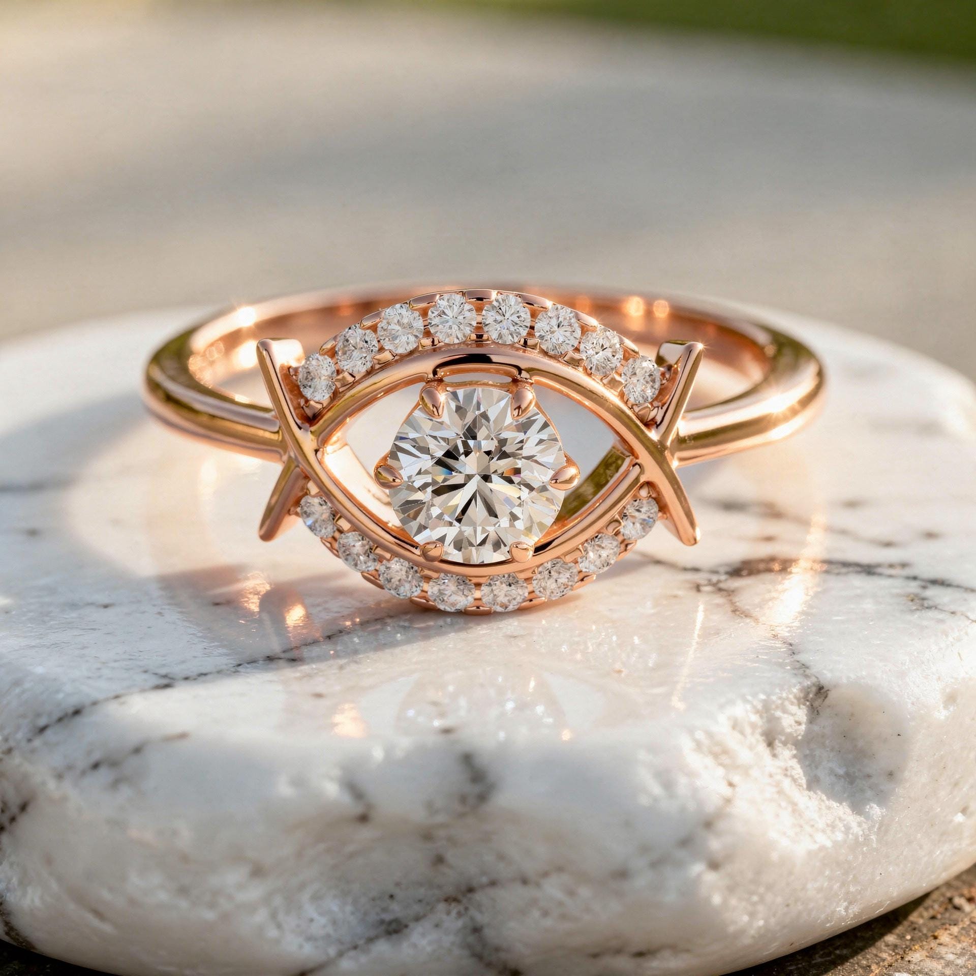 - Evil Eye Engagement Ring Round Halo Moissanite or Lab Grown Diamond Solid Gold