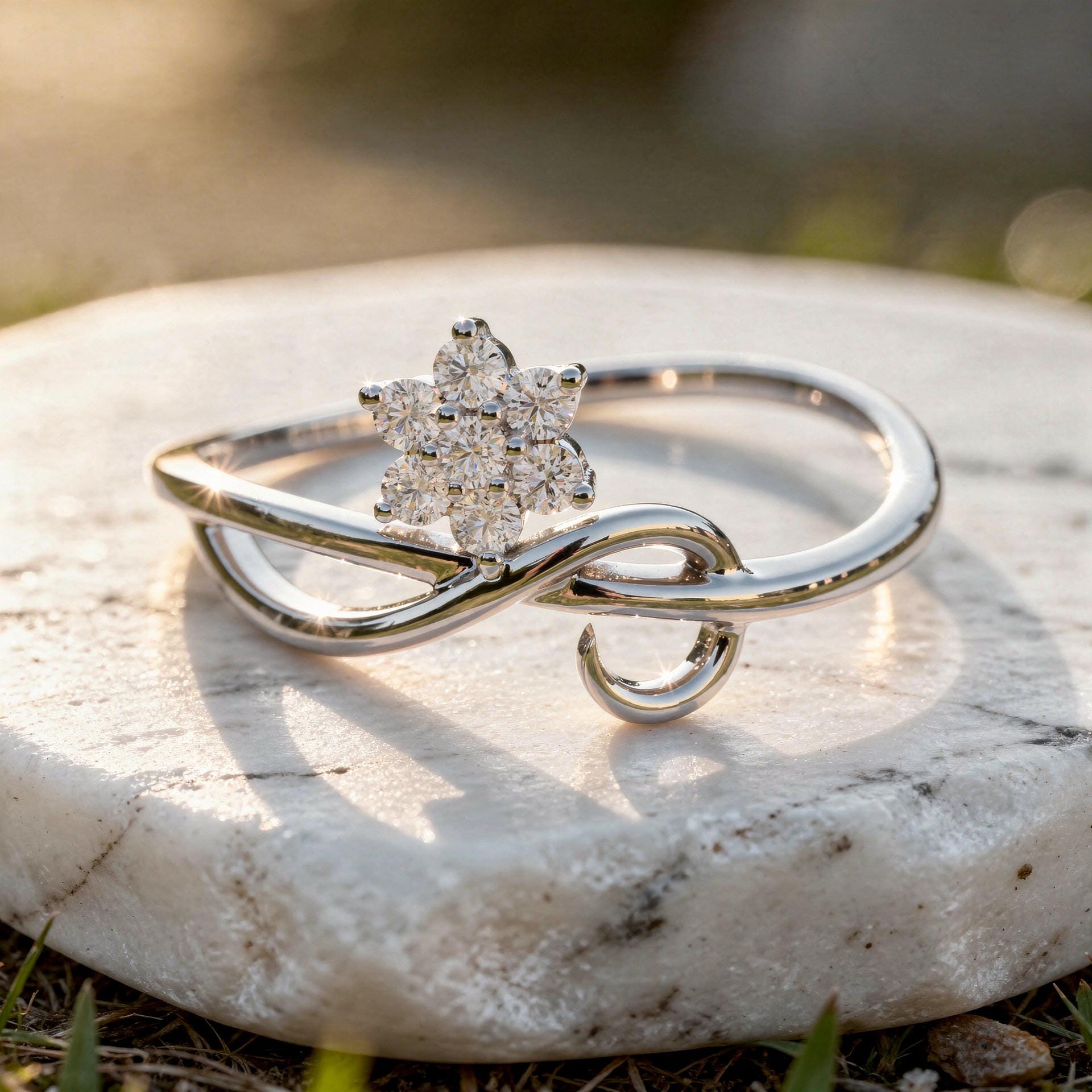 A delicate floral-inspired diamond ring featuring a cluster of round diamonds arranged in a blooming flower motif. The flowing bypass design wraps softly around the finger, creating an elegant and feminine silhouette with a light, airy feel.