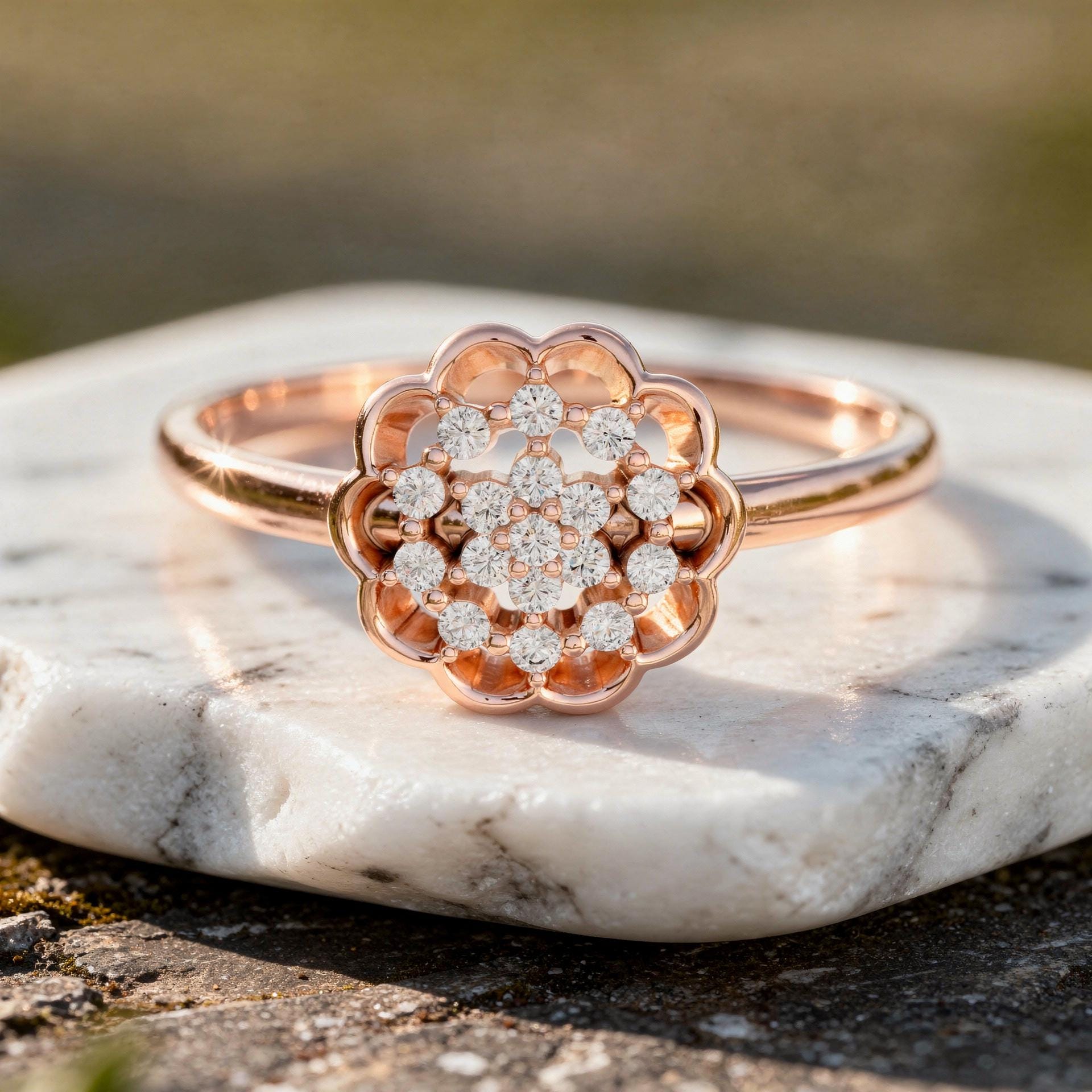 A delicate floral diamond cluster ring crafted with a soft scalloped petal outline and multiple round diamonds arranged in a blooming formation. The rose-toned metal enhances warmth and brilliance, creating a timeless yet romantic design perfect for everyday elegance or meaningful gifting.