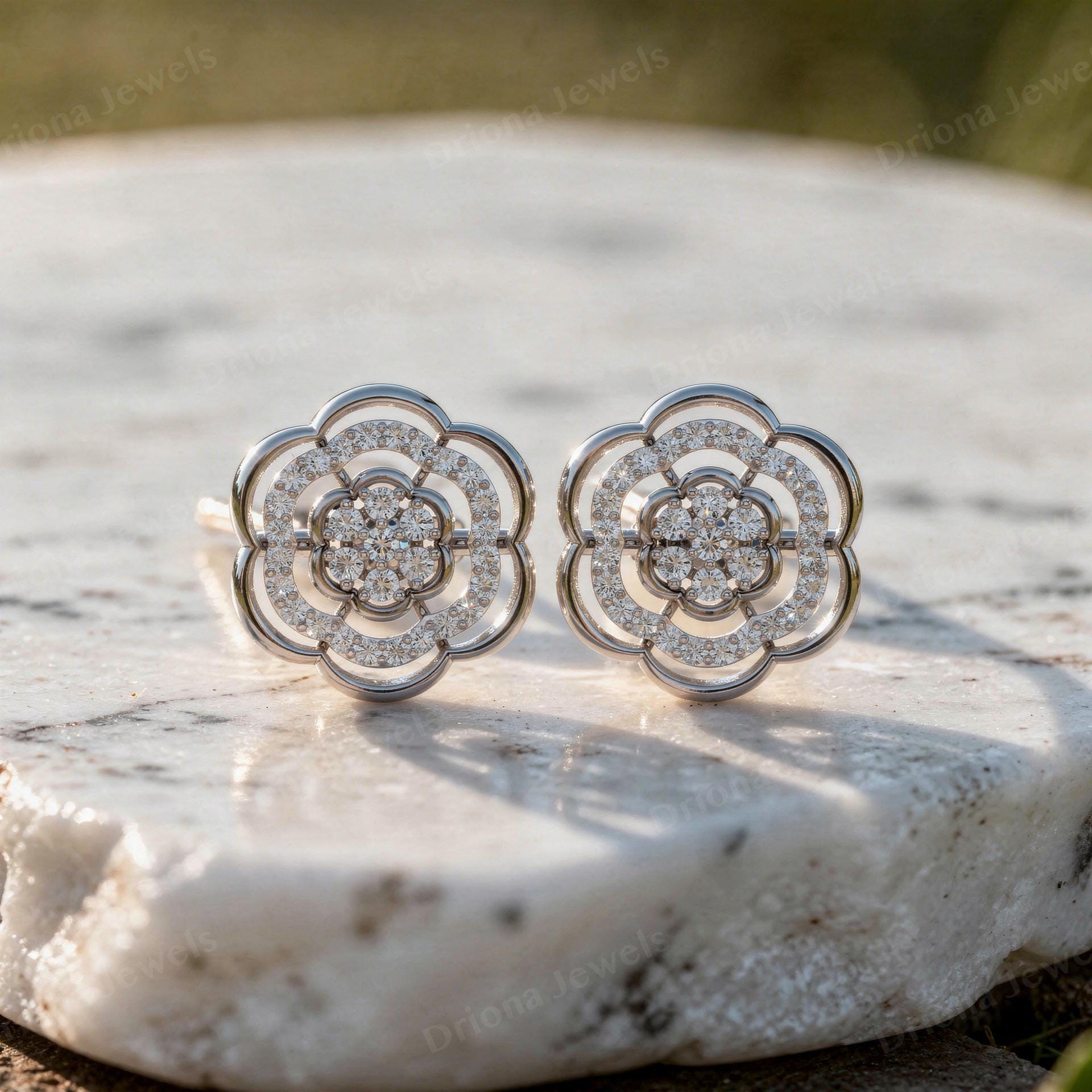 - Floral Diamond Cluster Stud Earrings – Elegant Flower Halo Design