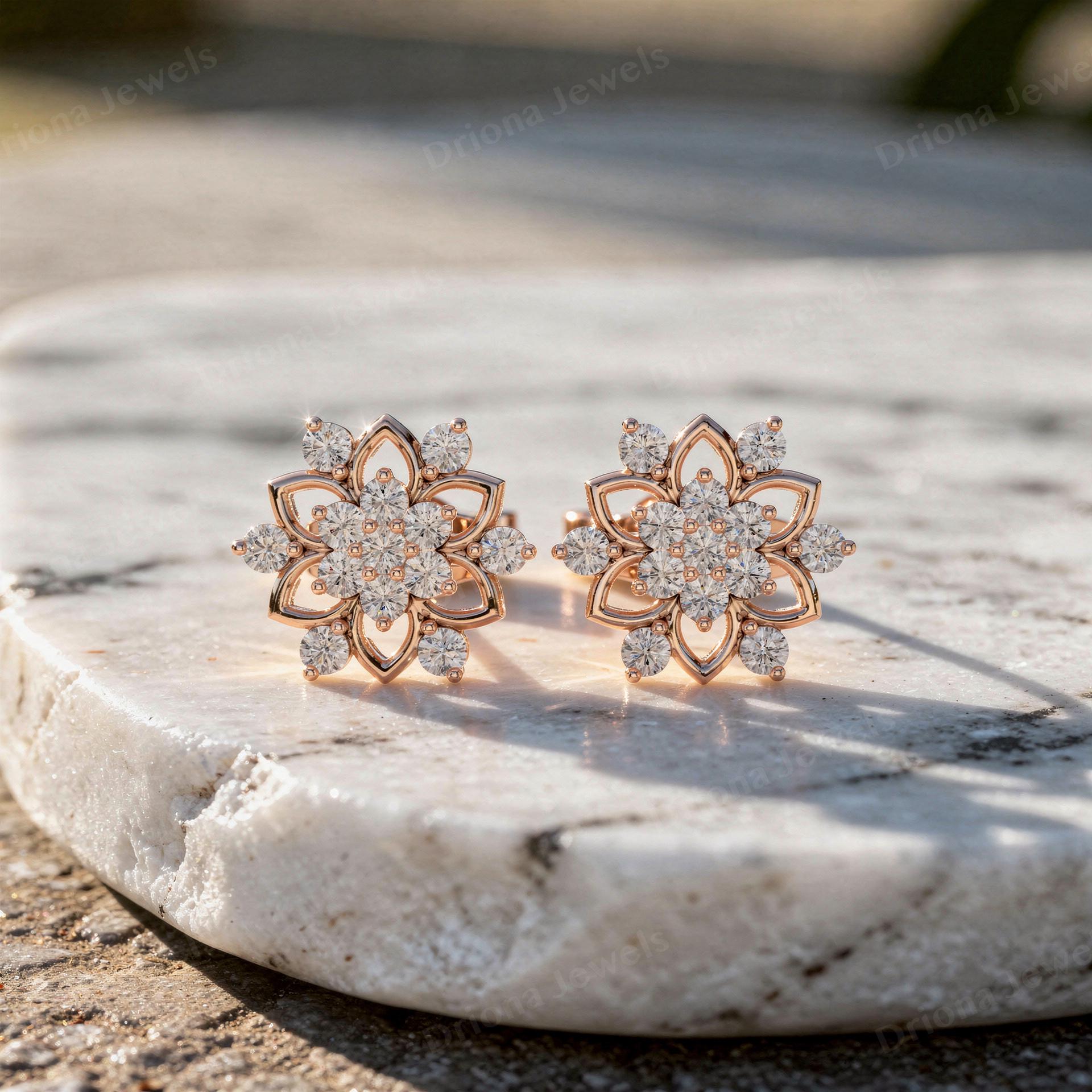 - Floral Diamond Cluster Stud Earrings – Rose Gold Flower Design