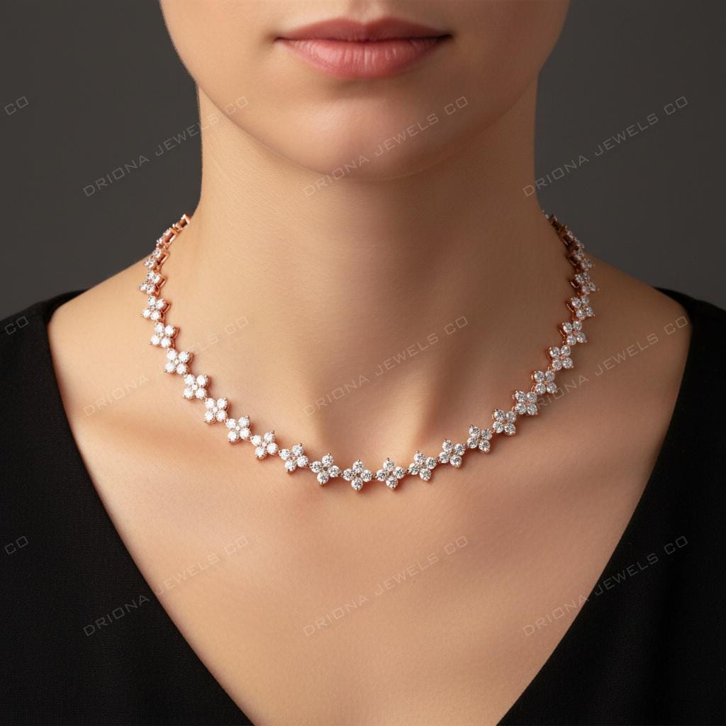 This exquisite floral diamond necklace features a continuous arrangement of delicately crafted flower motifs, creating a graceful and luxurious silhouette around the neckline. Each floral element is designed to sparkle beautifully, giving the necklace a timeless and elegant presence.