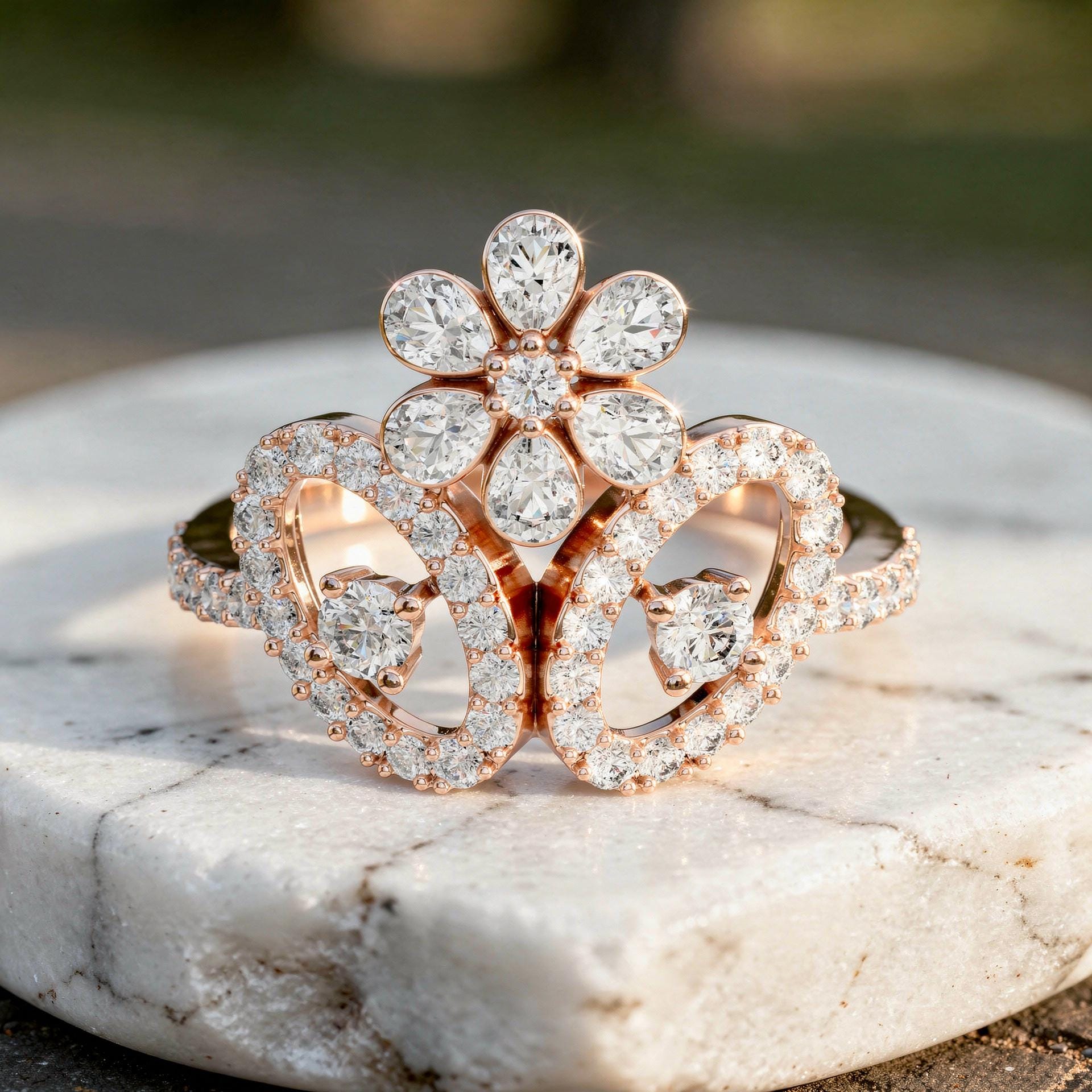 This elegant statement ring showcases a blooming floral centerpiece formed by pear-shaped diamonds arranged like petals around a round brilliant center. The flower is framed by mirrored open halos on both sides, each lined with pavé diamonds, creating depth, symmetry, and exceptional sparkle. The design blends soft floral beauty with a bold architectural presence, making it a standout luxury piece.