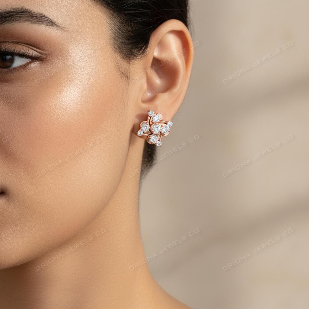 These floral cluster diamond stud earrings showcase a refined flower-inspired design, worn beautifully on the earlobe for a natural, elegant look. Crafted in warm rose gold, the clustered round diamonds create a soft sparkle that enhances everyday outfits while remaining timeless enough for special occasions.