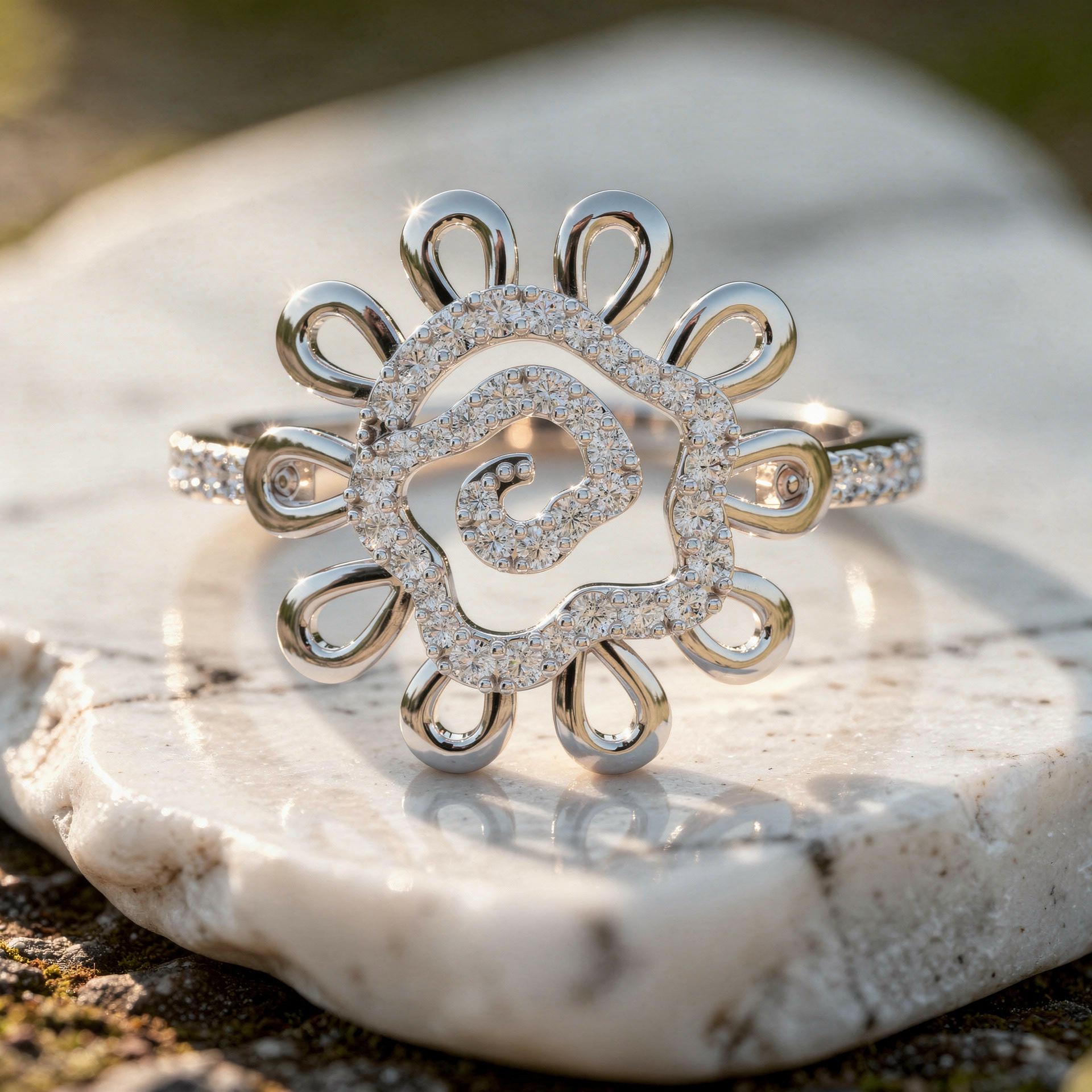 This elegant statement ring features a graceful floral swirl design with open petal motifs surrounding a pavé diamond spiral center. The layered openwork structure creates depth and movement, while round brilliant diamonds add refined sparkle. A bold yet feminine ring that blends floral softness with modern craftsmanship.