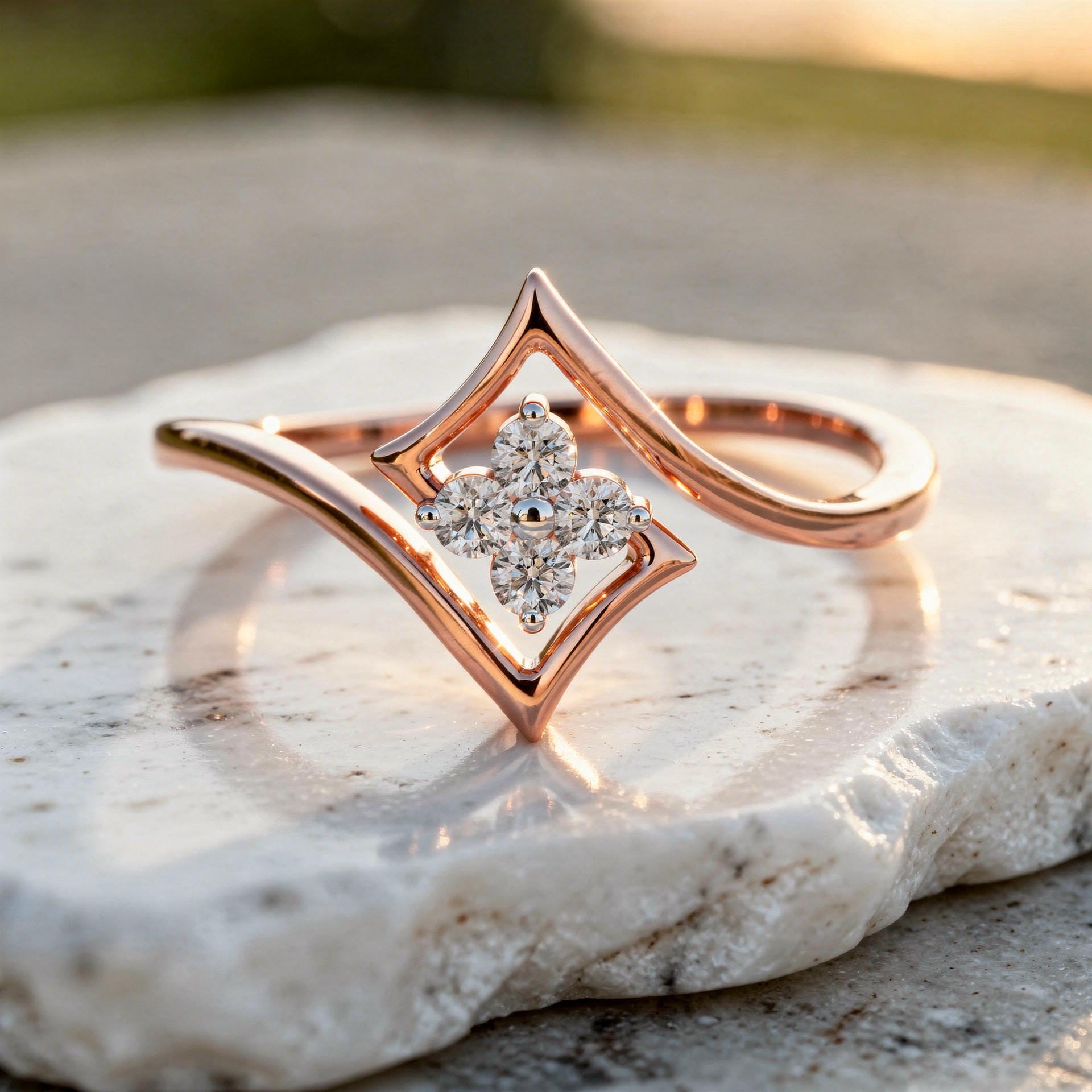 A modern geometric diamond ring featuring a floating square-frame motif with a delicate four-stone diamond cluster at the center. The open frame design creates a light, airy look, while the flowing band adds elegance and comfortβperfect for everyday wear or minimalist statement styling.