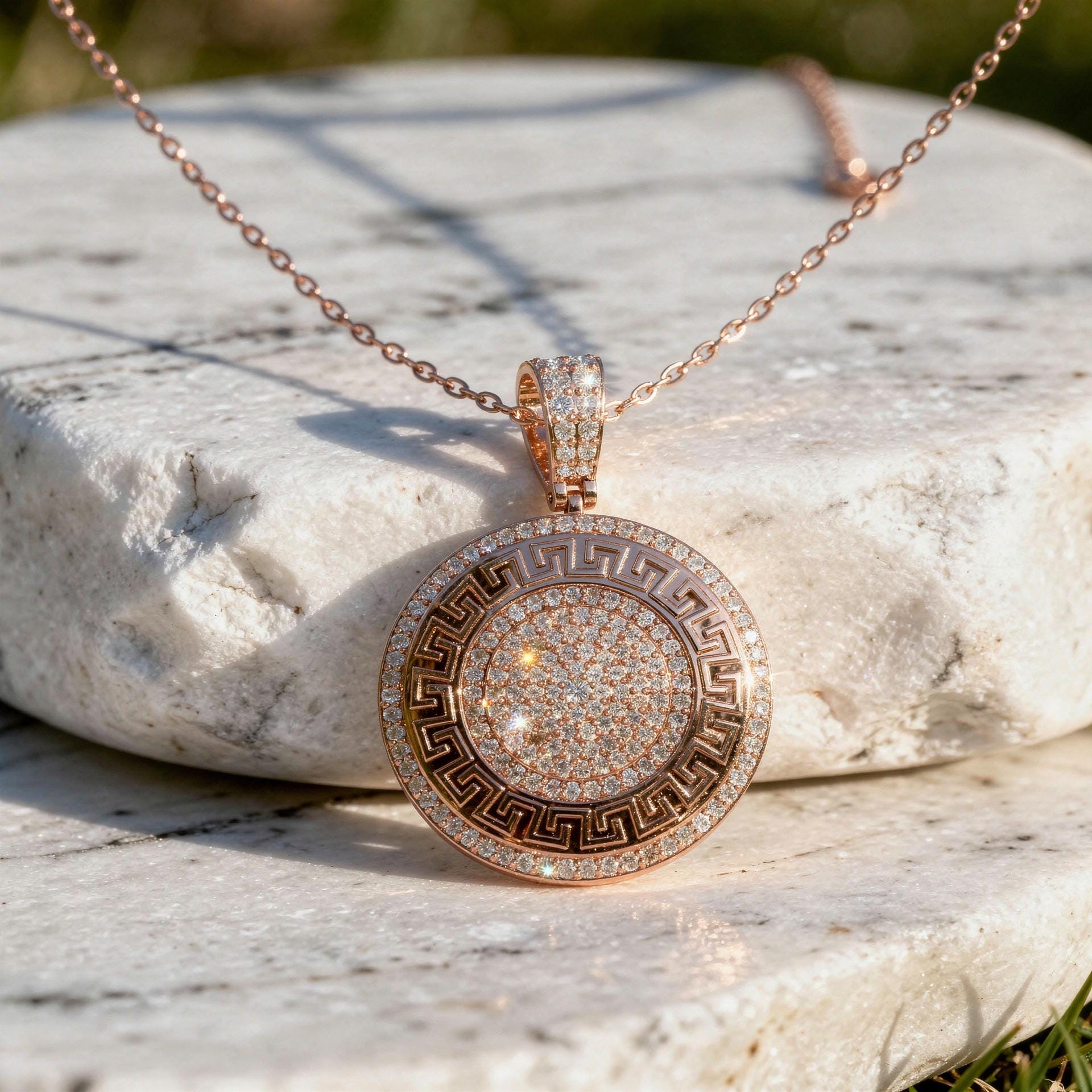 Crafted in solid 14K rose gold, this diamond medallion pendant showcases intricate geometric detailing framed by a bold Greek key motif.