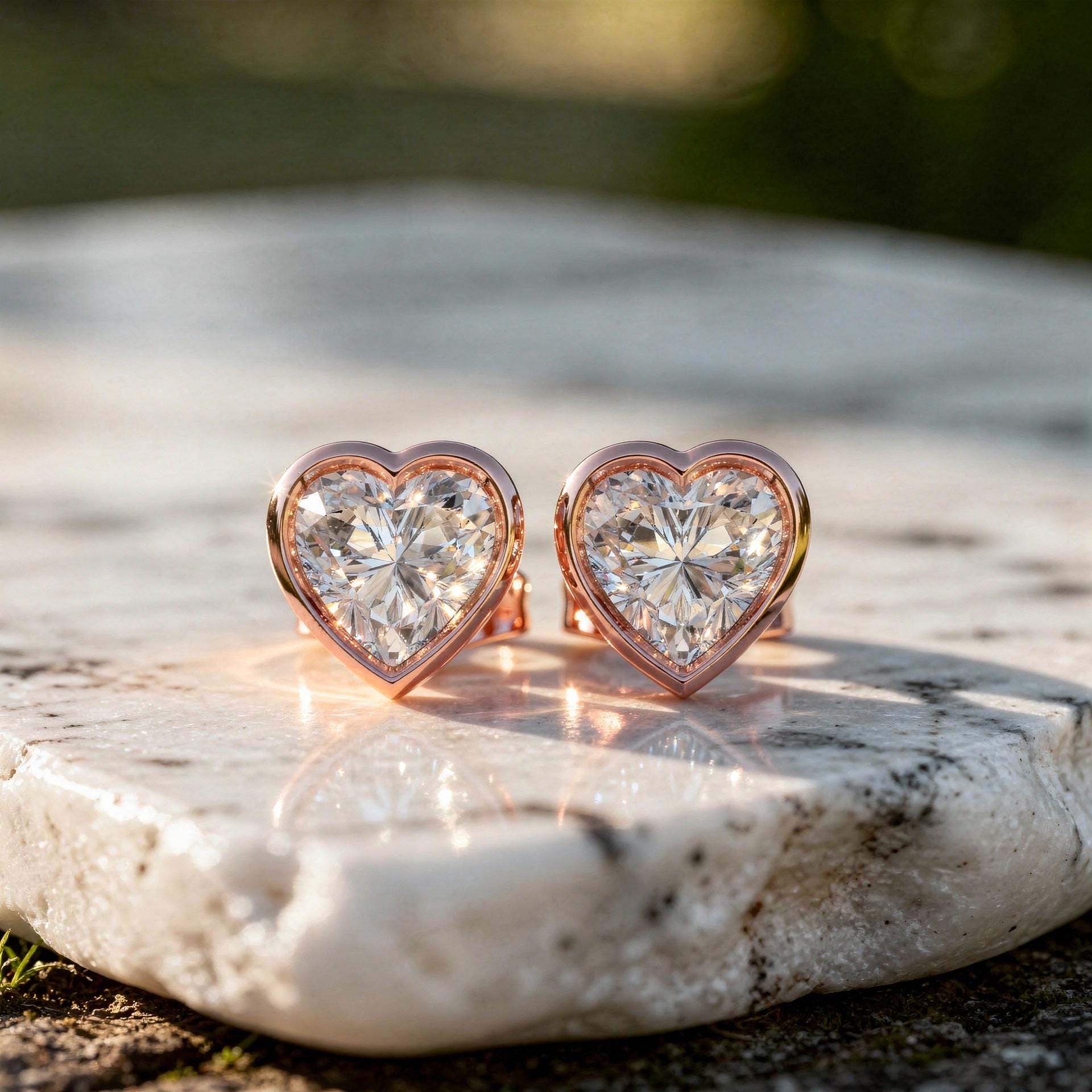 - Heart Cut Lab-Grown Diamond Stud Earrings, Bezel Set, Solid Gold