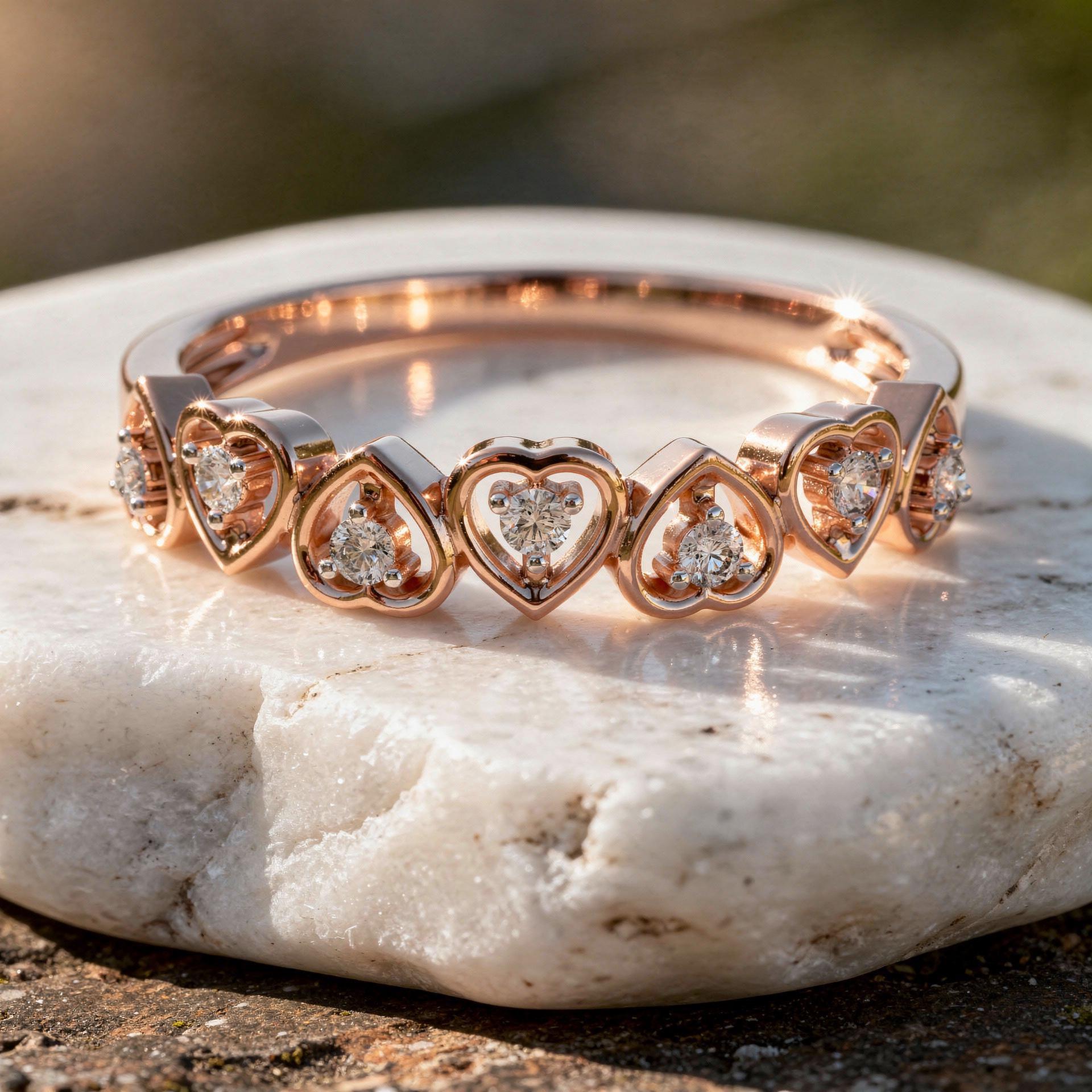 Each diamond is securely set within a partial bezel and prong combination, offering both protection and brilliance. The balanced spacing of the hearts creates a graceful rhythm along the band, making this ring perfect as a wedding band, promise ring, or meaningful anniversary gift. Its refined simplicity allows it to stack effortlessly or shine beautifully on its own.