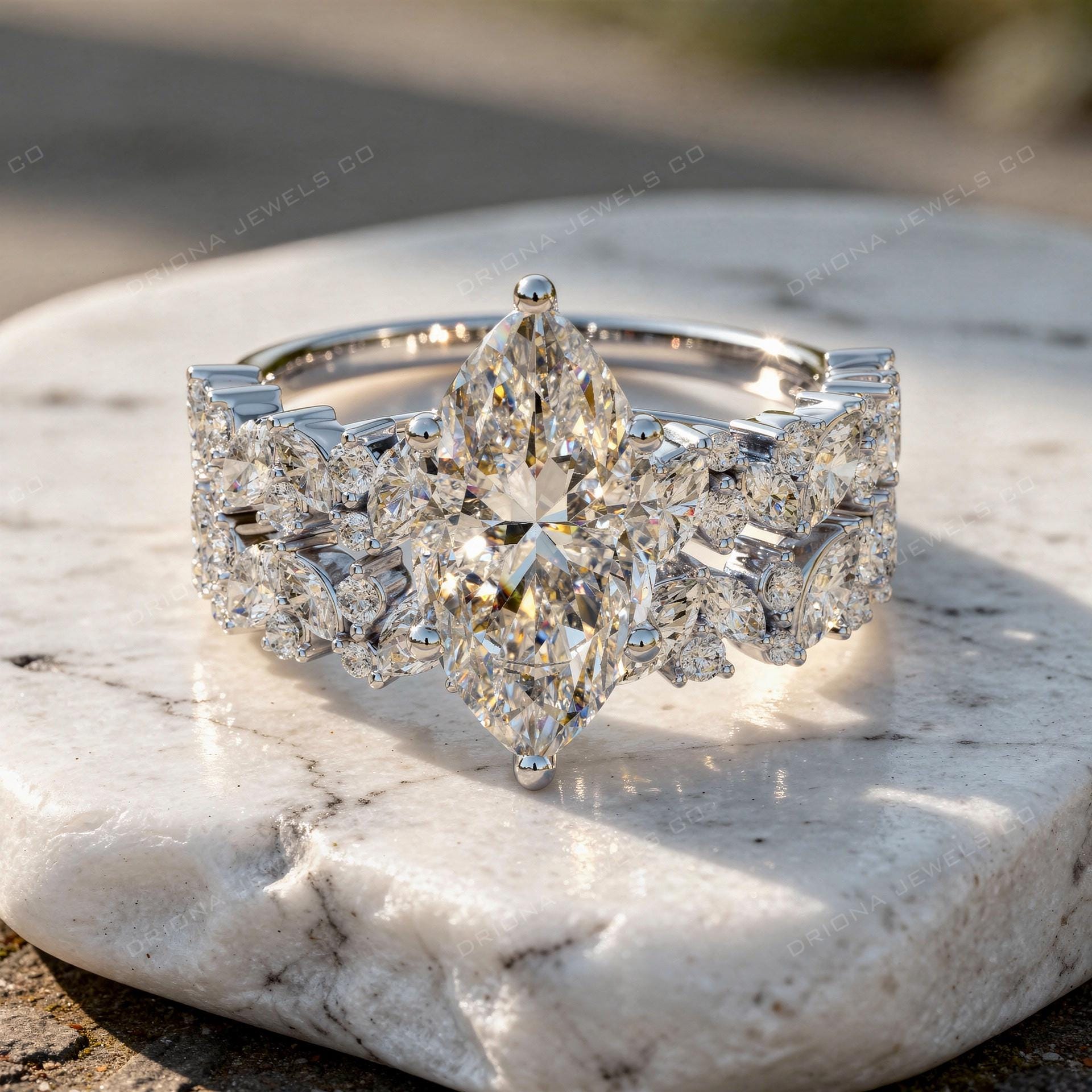 - Marquise Cut Diamond Engagement Ring with Floral Side Stones, Elegant Bridal Statement Ring