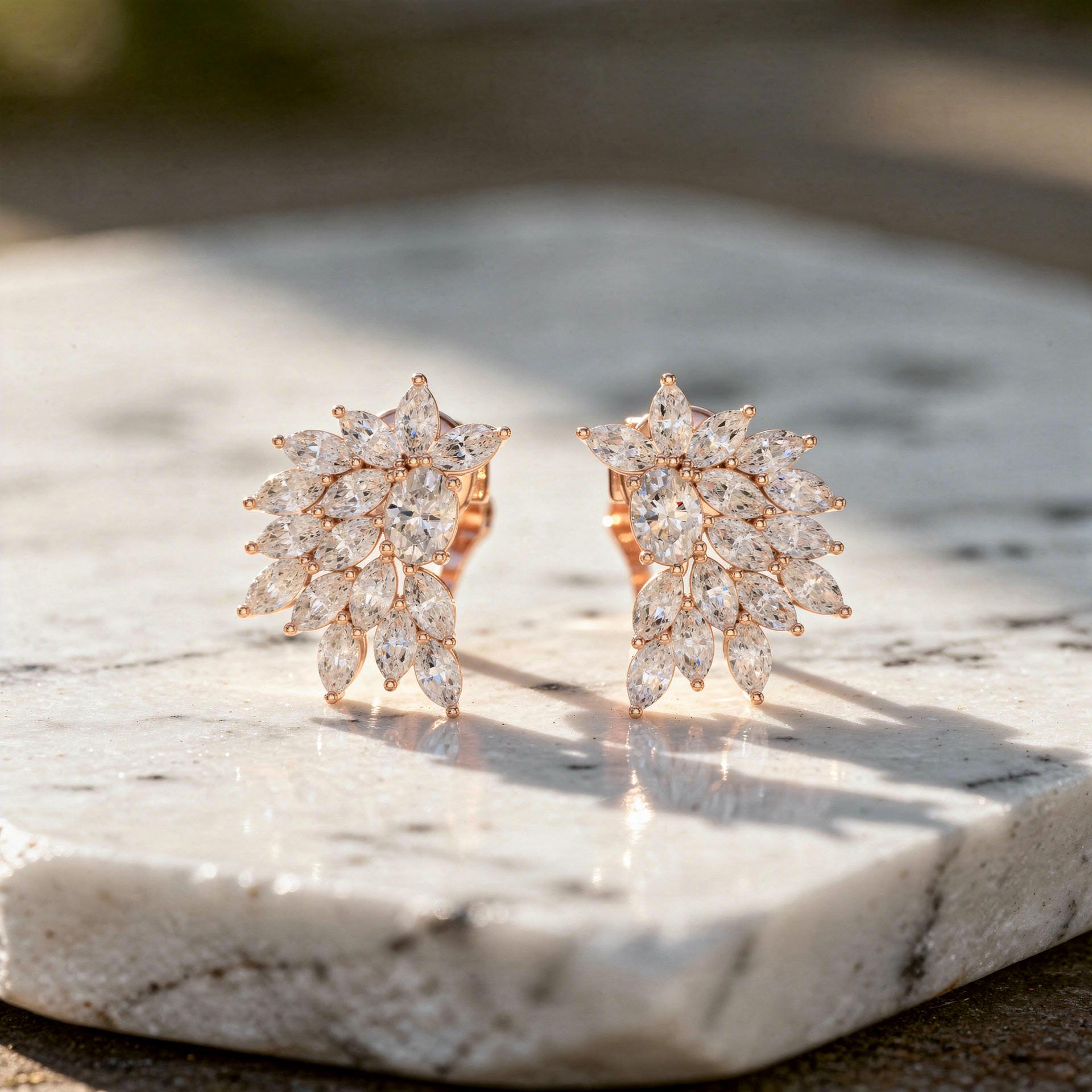 These statement marquise diamond stud earrings feature an intricate floral-inspired cluster arrangement designed for maximum brilliance. The layered marquise stones create movement, dimension, and luxurious sparkle.