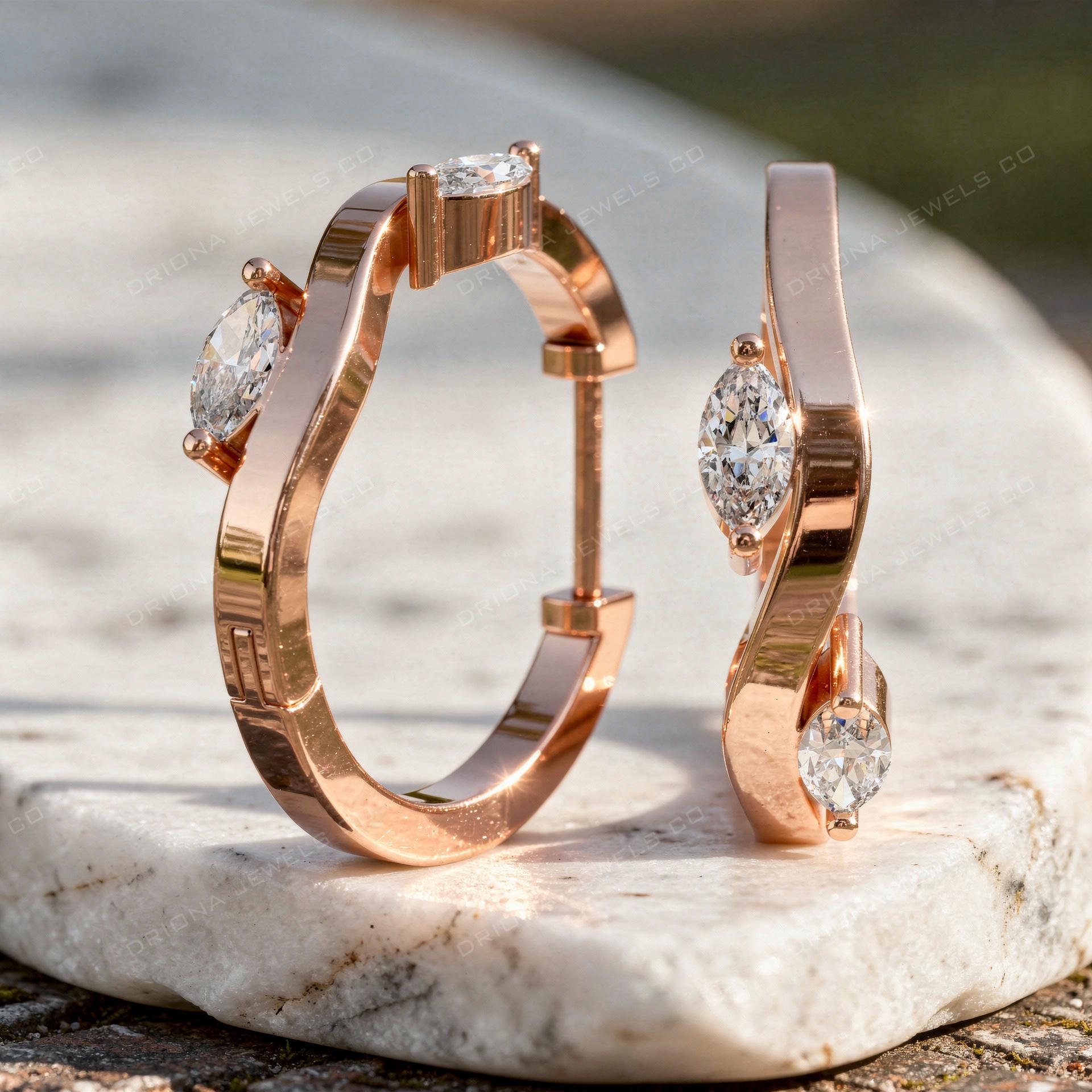 These modern marquise diamond hoop earrings feature a sleek curved silhouette with delicately set marquise-cut diamonds that add refined brilliance from every angle. The flowing design creates a contemporary yet elegant look, perfect for daily wear or elevated occasions.