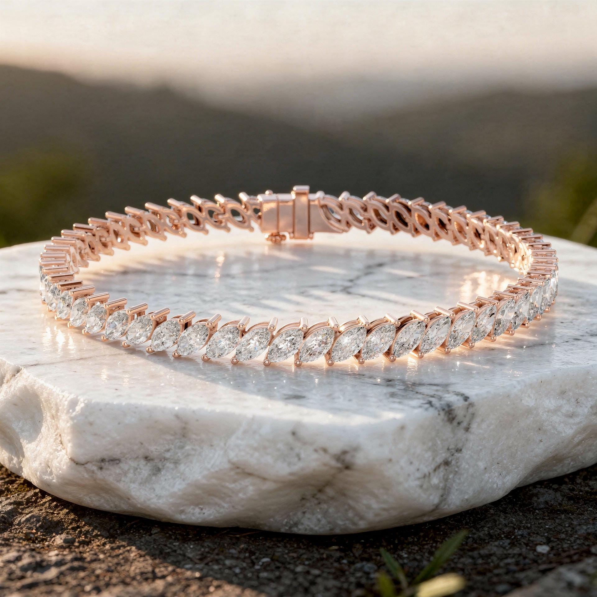 This elegant tennis bracelet features a continuous row of marquise-shaped diamonds, precisely aligned to create a graceful, leaf-inspired silhouette. The elongated marquise stones enhance brilliance while offering a refined and flattering look on the wrist.