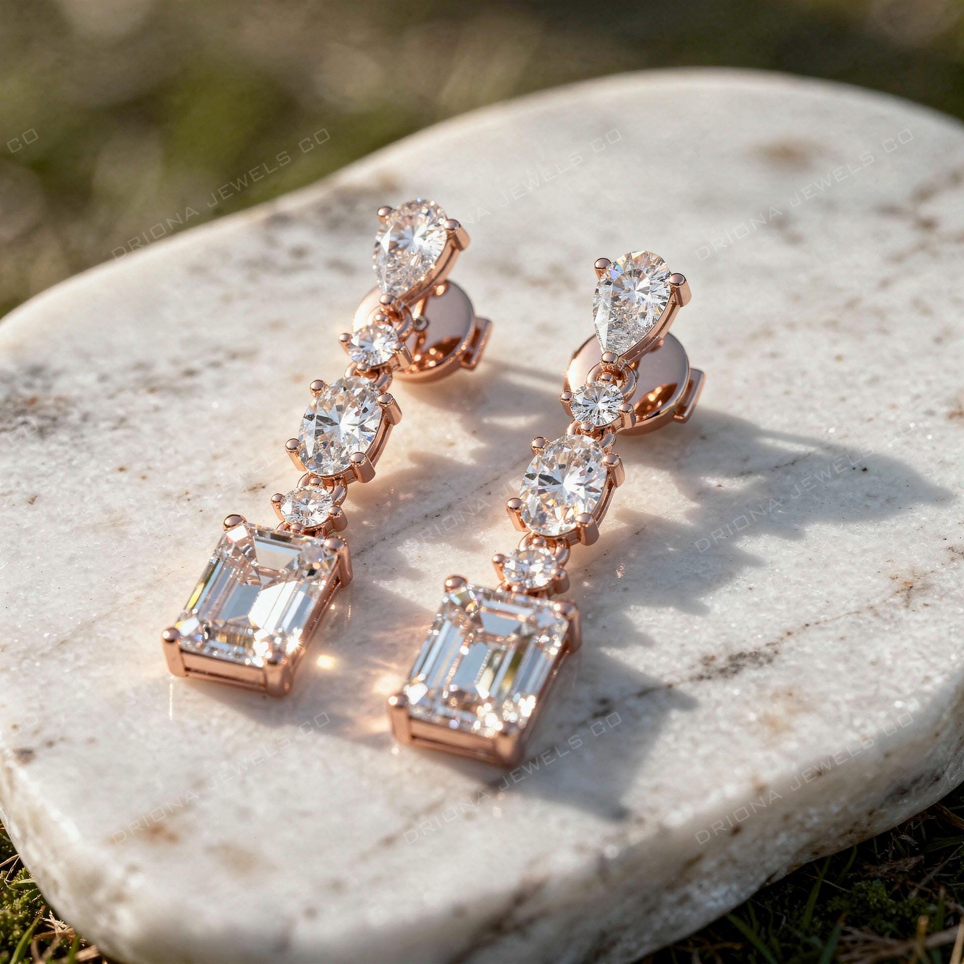 These elegant mixed-shape diamond drop earrings feature a refined vertical arrangement combining emerald cut, oval, and round diamonds for a balanced and luxurious look. The elongated silhouette enhances sparkle while maintaining a clean, modern aesthetic.
