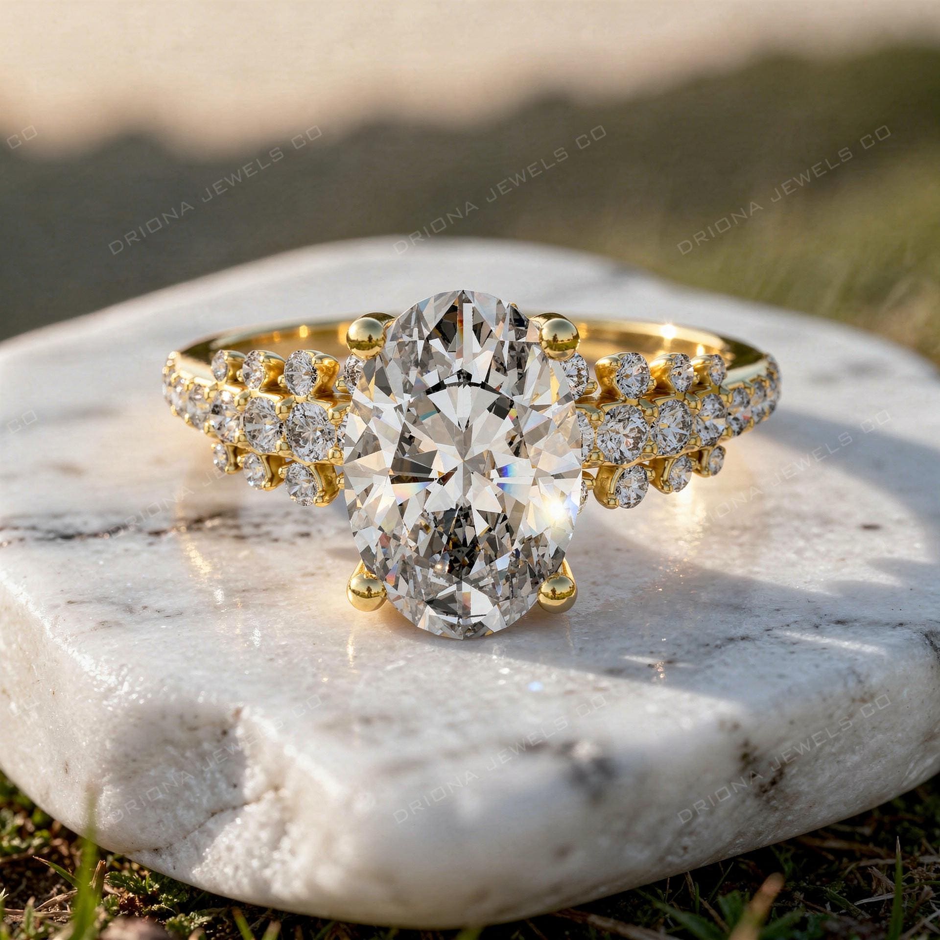 This oval cut engagement ring showcases a brilliant elongated center stone enhanced by a shimmering diamond cluster along a refined split shank. The layered pavΓ© accents add depth and sparkle, creating a bold yet elegant silhouette. Perfect for engagements, anniversaries, or a luxurious promise ring, this design blends modern sophistication with timeless bridal appeal.
