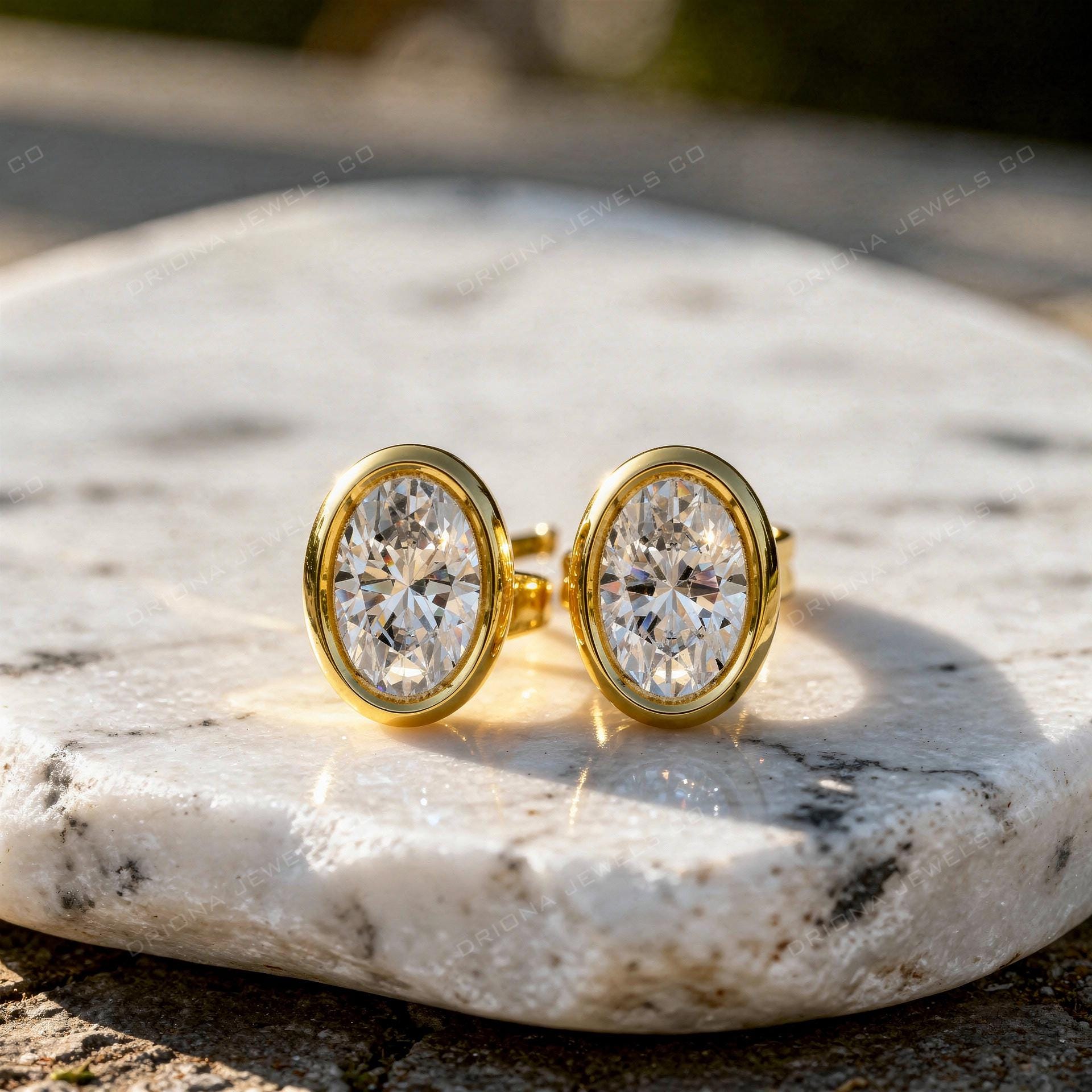 - Oval Cut Diamond Stud Earrings, Bezel Set, Solid Gold or Silver