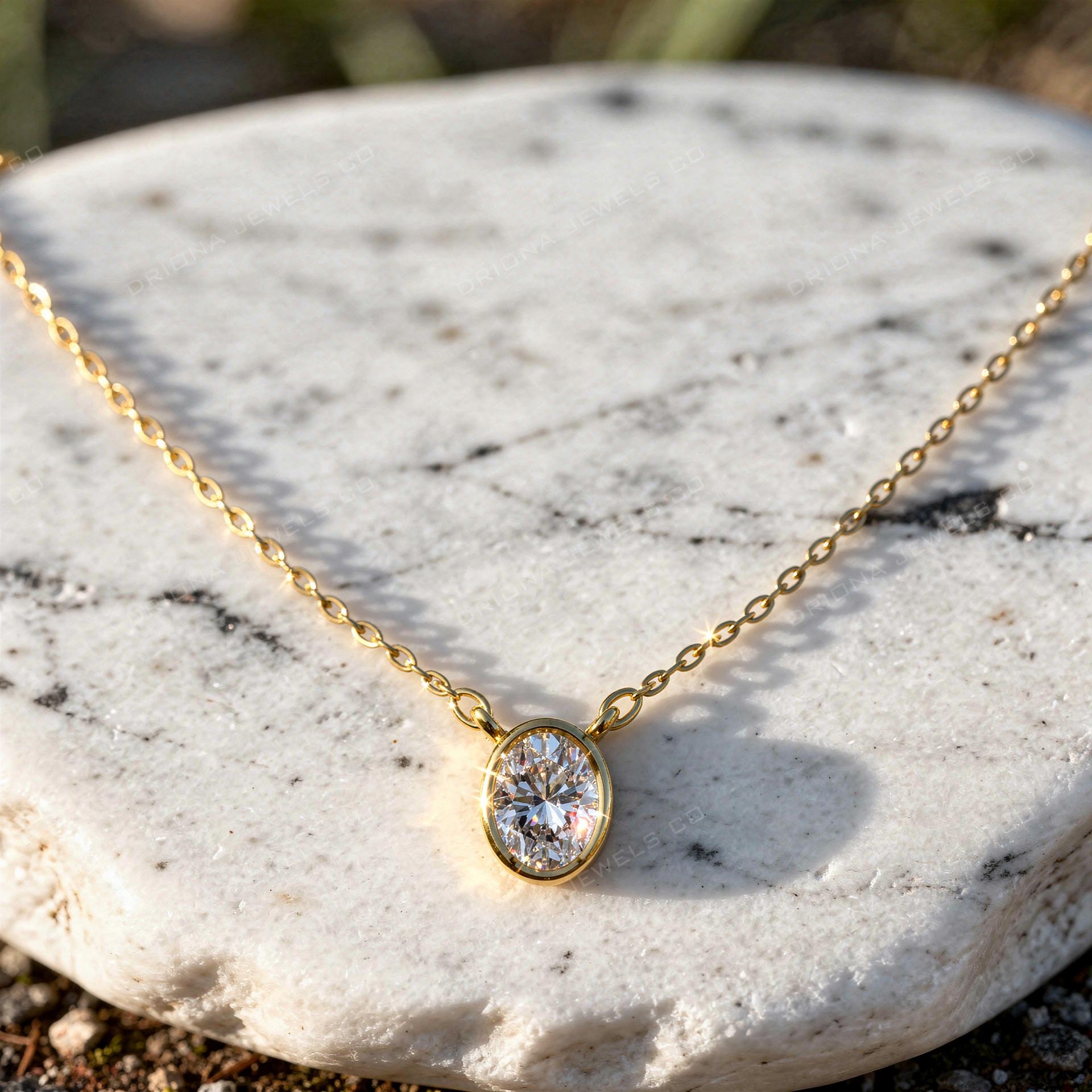 - Oval Lab Grown Diamond Necklace, Bezel Solitaire Pendant, Solid Gold or Silver
